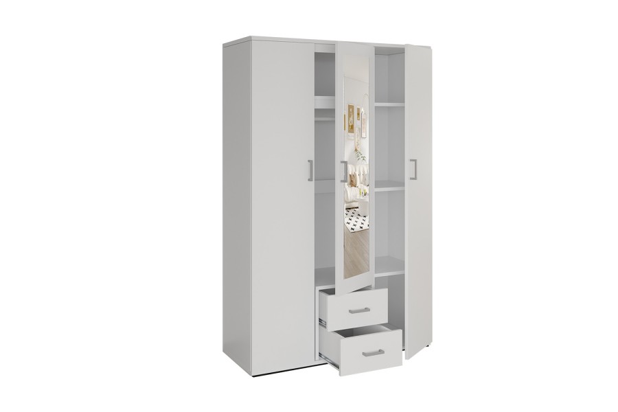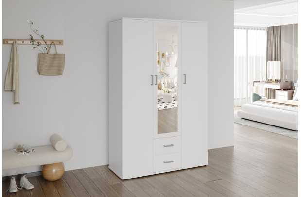 - 3 portes : L’armoire est équipée de trois portes, dont une avec un miroir en pied qui ajoute de la profondeur et de la lumière à la pièce, tout en vous permettant de vérifier facilement votre tenue.