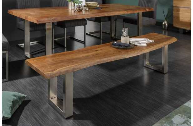 Un banc en bois d'acacia naturel, avec des pieds en métal chromé parfait pour un intérieur luxueux.