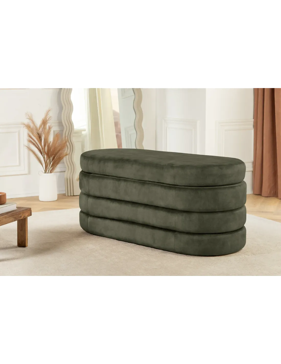 La banquette coffre VOQUE en velours vert combine style moderne, confort et rangement pratique. Elle est idéale pour optimiser vos espaces tout en apportant une touche décorative élégante et fonctionnelle dans le salon, la chambre ou l’entrée.