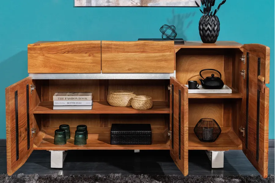 Buffet en bois massif d'acacia avec cadre en acier inoxydable – Finition miel naturel et argent