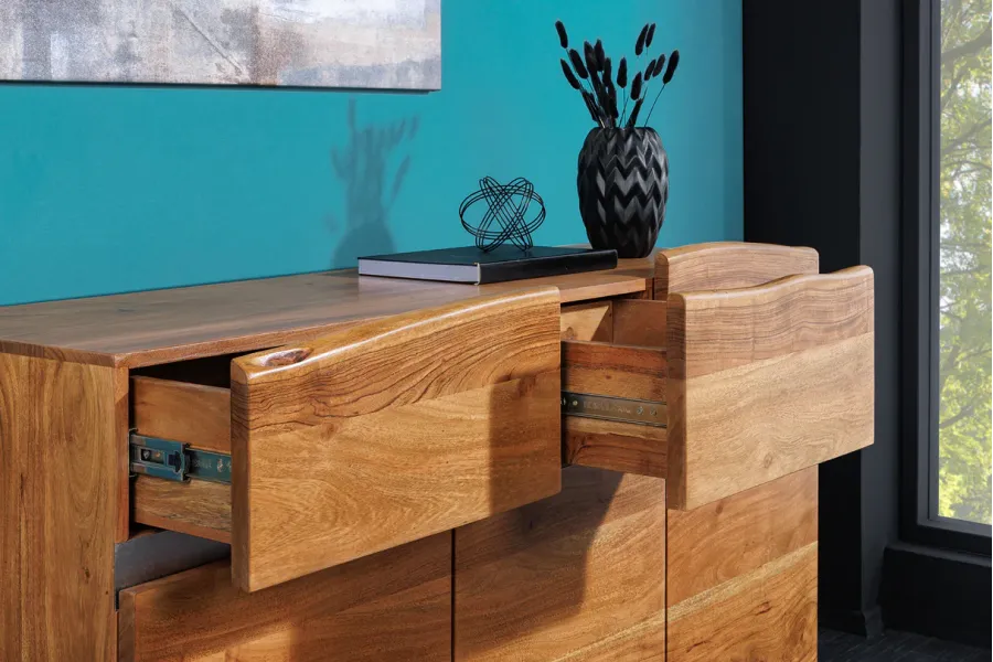 - Structure principale : Fabriqué en bois massif d'acacia, ce buffet est à la fois solide et durable, apportant une sensation de qualité et d'authenticité à votre espace. Le bois d'acacia est connu pour sa résistance et ses magnifiques nuances naturelles.
