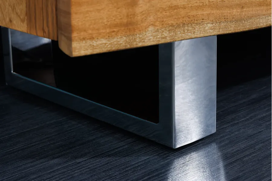 - Cadre : Le cadre est en acier inoxydable poli, offrant une touche contemporaine et élégante avec sa finition argentée. Cette combinaison du bois et de l'acier crée un contraste visuel saisissant, parfait pour des intérieurs modernes ou industriels.