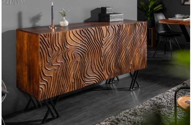 Le buffet Fluid s'inscrit dans un style industriel moderne, parfait pour les intérieurs contemporains et rustiques. Ses portes en bois massif sont sculptées avec soin, et les finitions en métal noir mat ajoutent une touche urbaine sophistiquée. Les pieds en métal surélevés apportent à l’ensemble une légèreté tout en garantissant une stabilité parfaite.