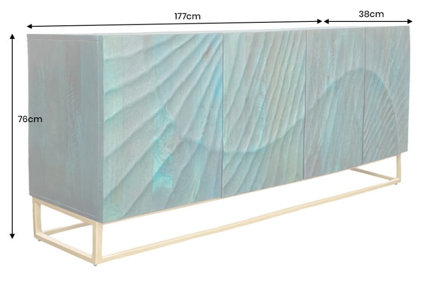 Ce buffet rétro chic 180 cm incarne une vision artistique du mobilier moderne. Son design sculpté en relief 3D évoque des vagues dynamiques, apportant du mouvement et de la profondeur à la façade. La finition turquoise vernie associée aux détails dorés crée une pièce forte, élégante et unique, parfaite pour sublimer un intérieur sophistiqué.