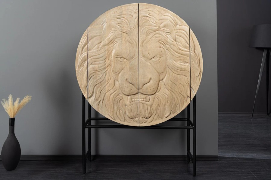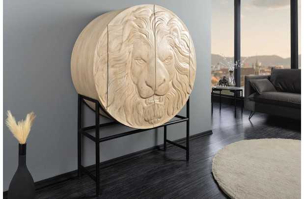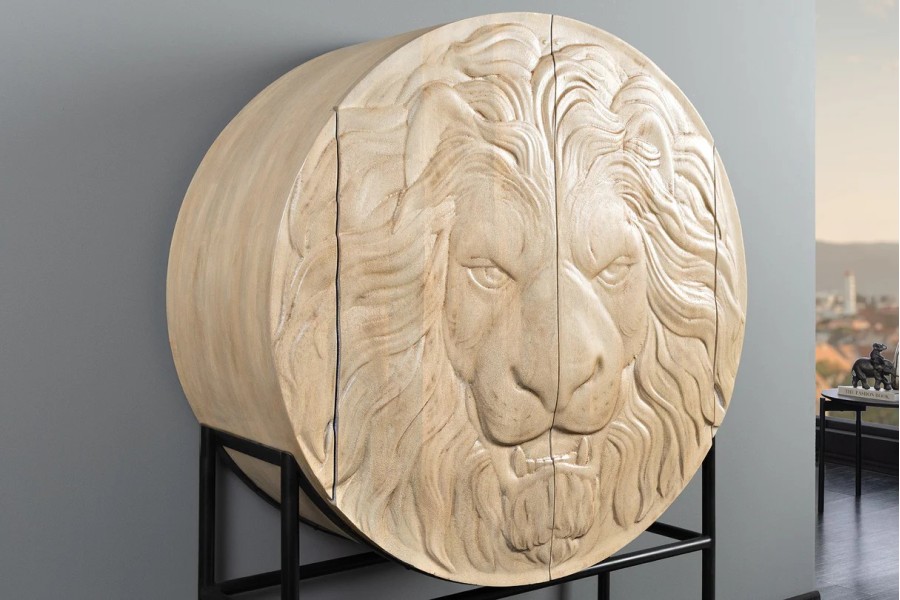 Ce buffet unique se distingue par sa façade sculptée en 3D, représentant une tête de lion imposante et détaillée. Véritable œuvre d’art, ce relief impressionnant confère au meuble un caractère fort et prestigieux, idéal pour un intérieur contemporain ou sophistiqué.