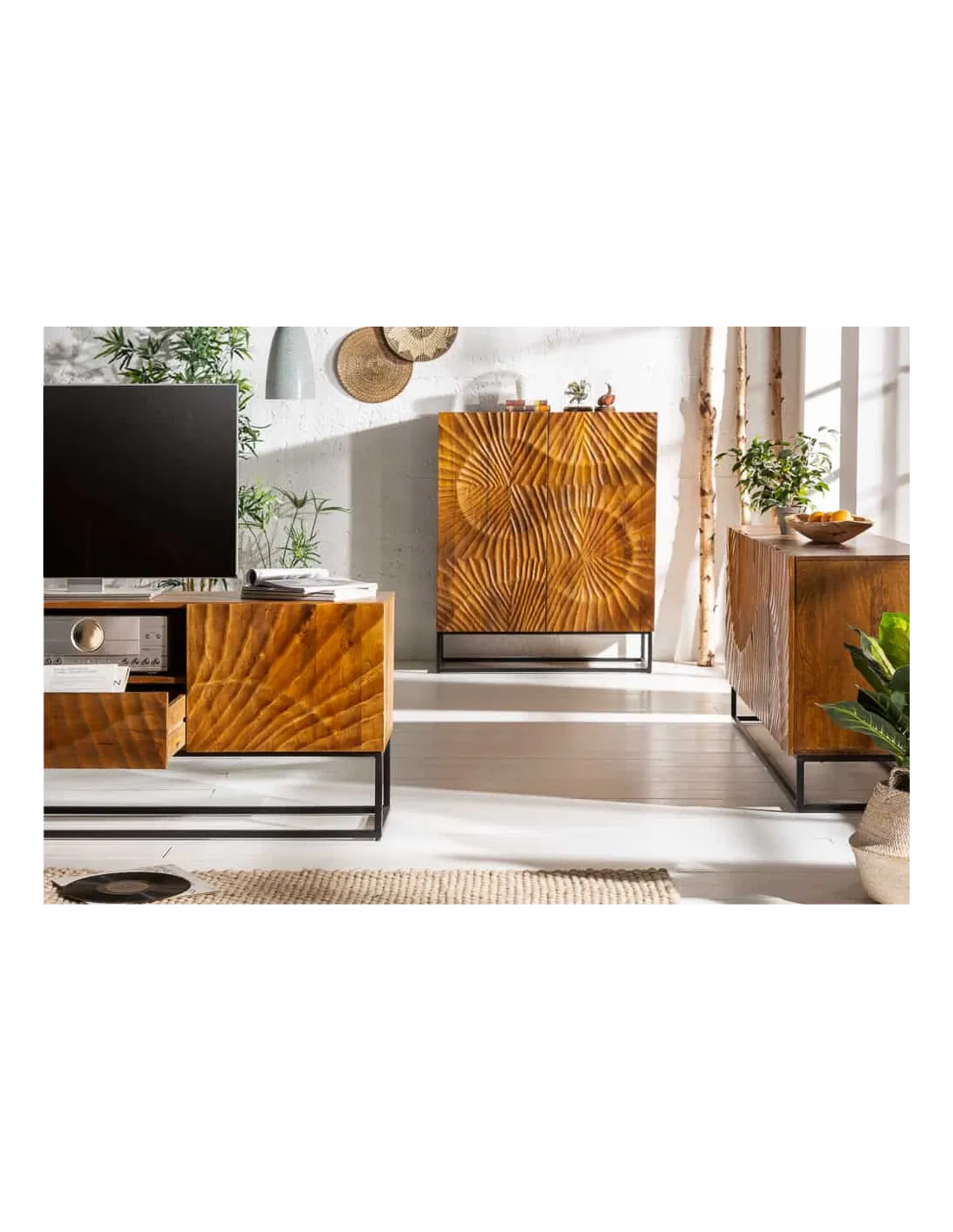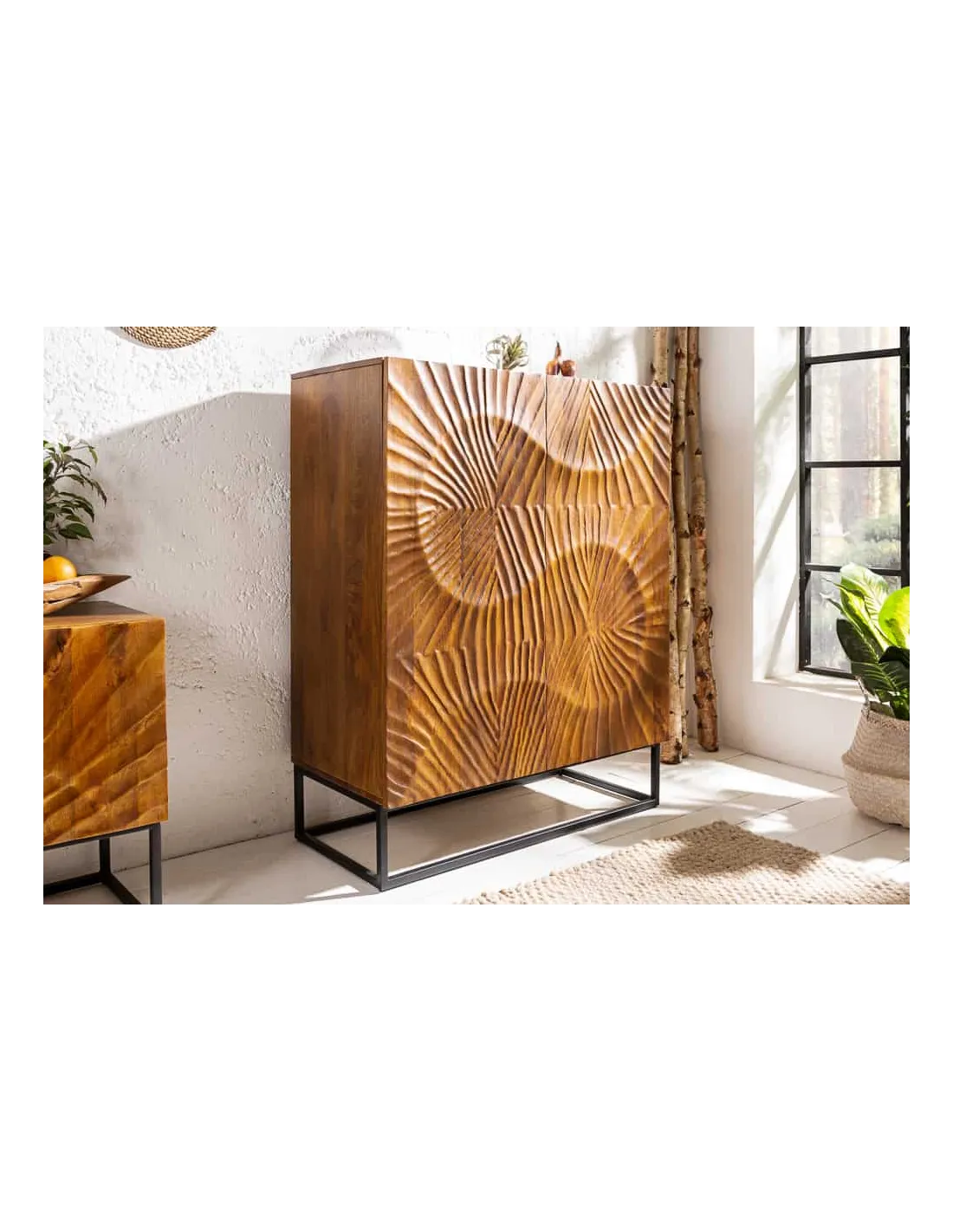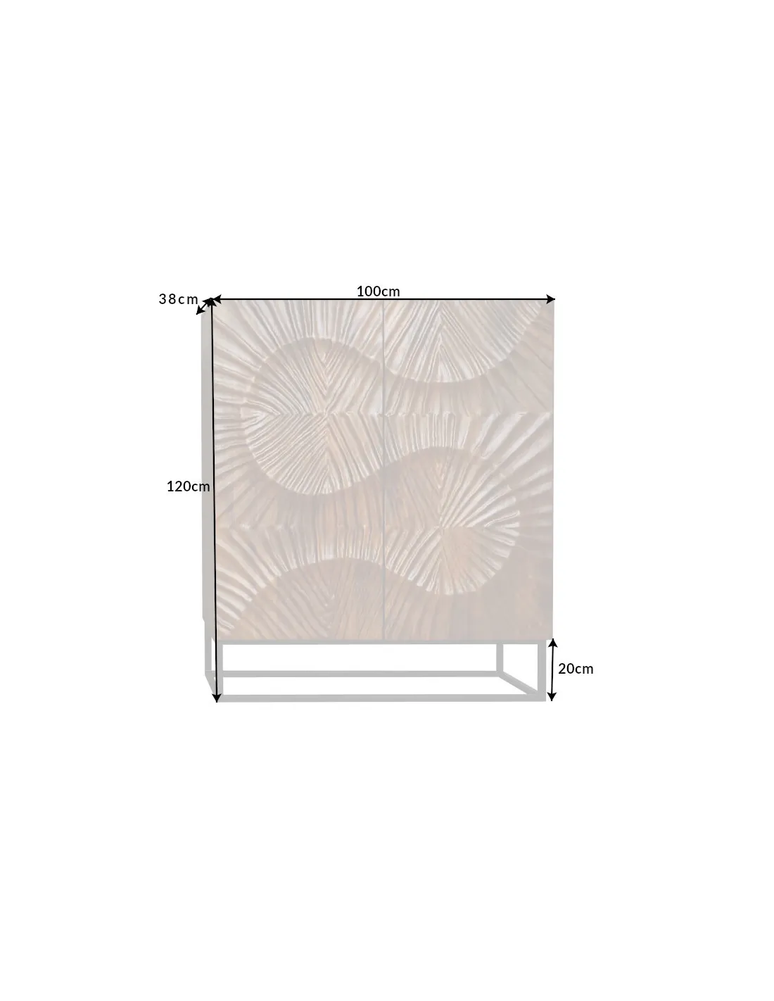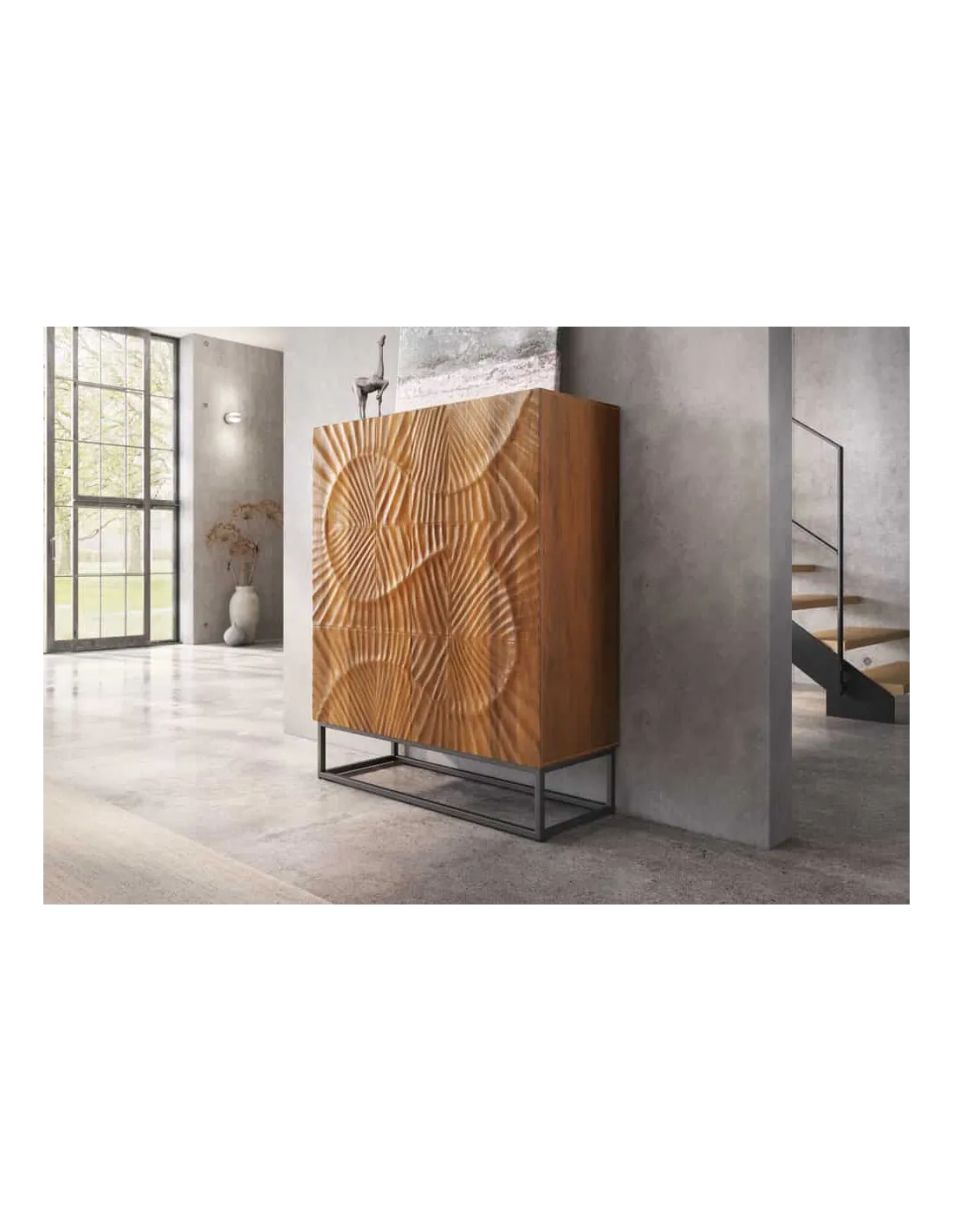 - Motif sculpté : La façade du buffet est ornée d'une sculpture en relief représentant un scorpion enroulé dans un décor tropical, sublimé par une finition marron.