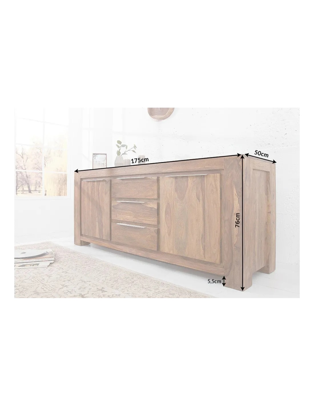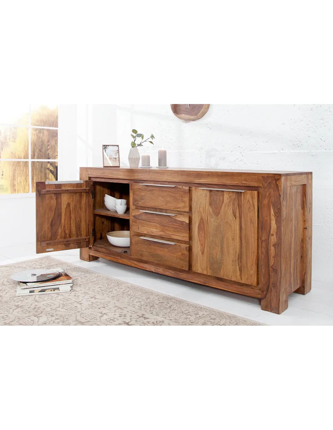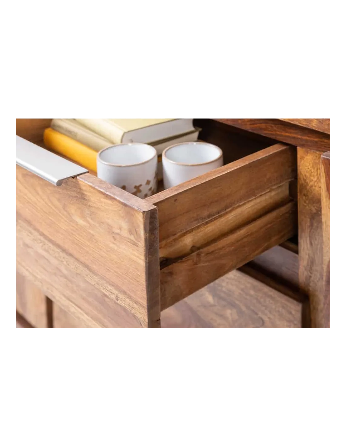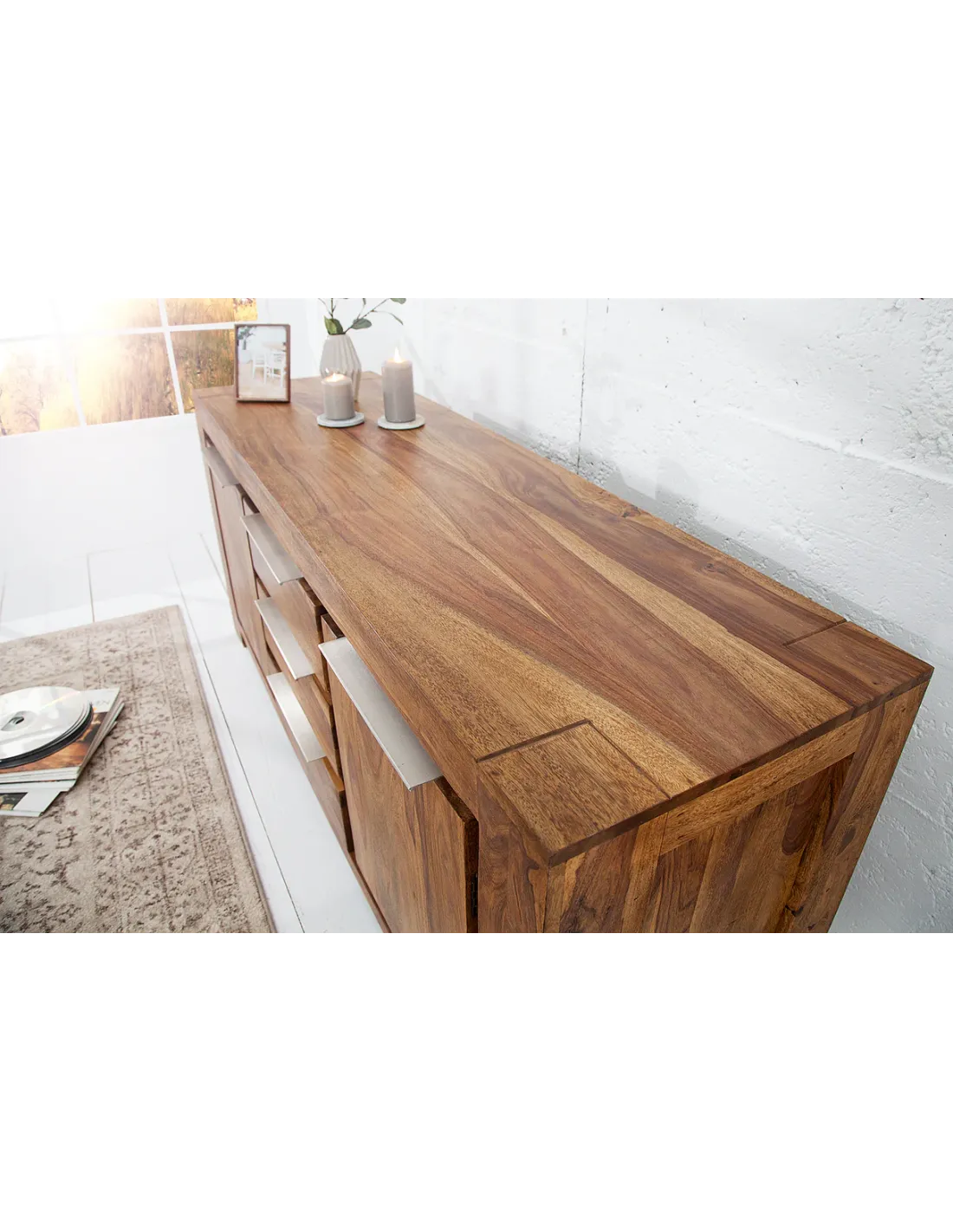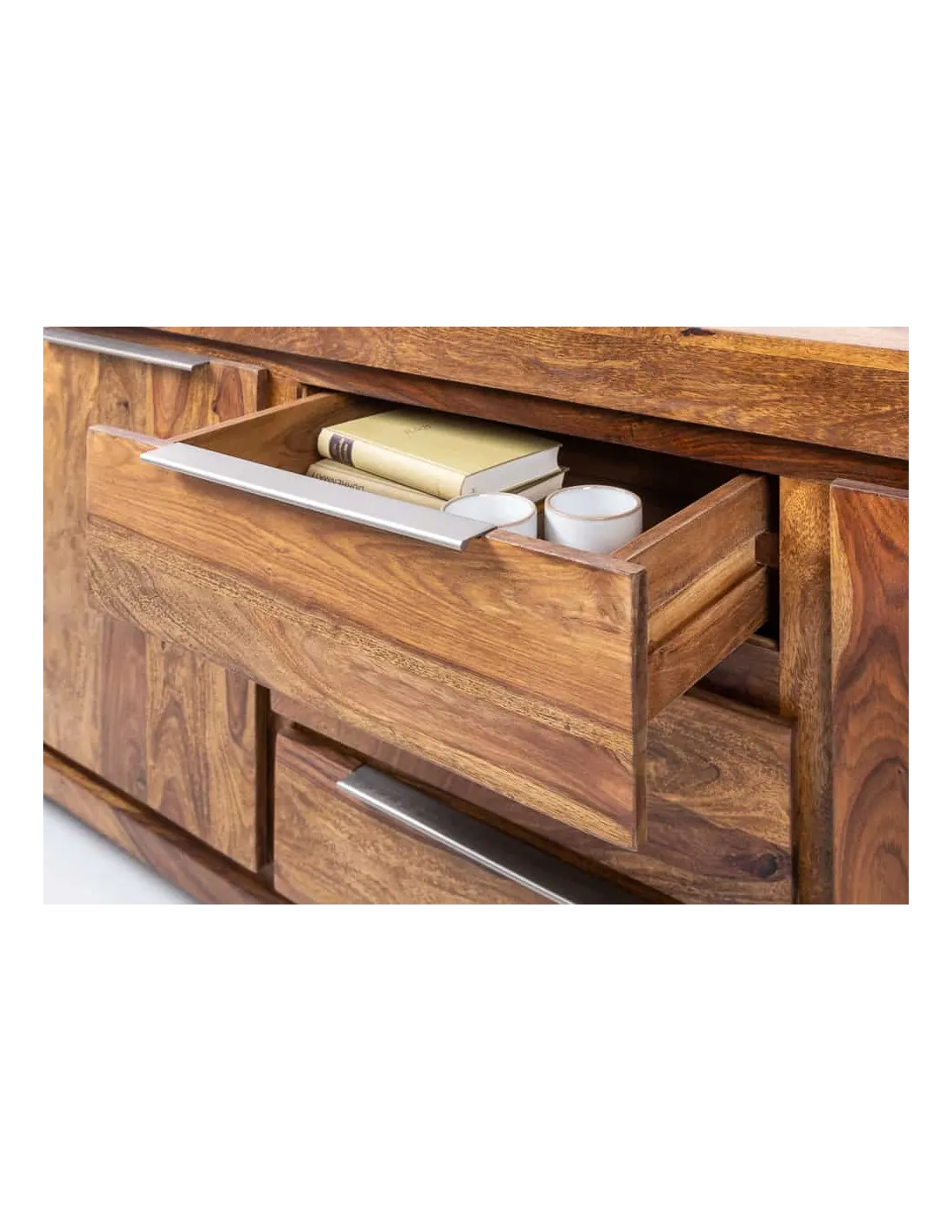 Entièrement fabriqué en bois massif de sheesham, ce buffet est conçu pour durer dans le temps et apporter une touche authentique à votre intérieur. Chaque pièce est unique grâce aux variations naturelles du bois.