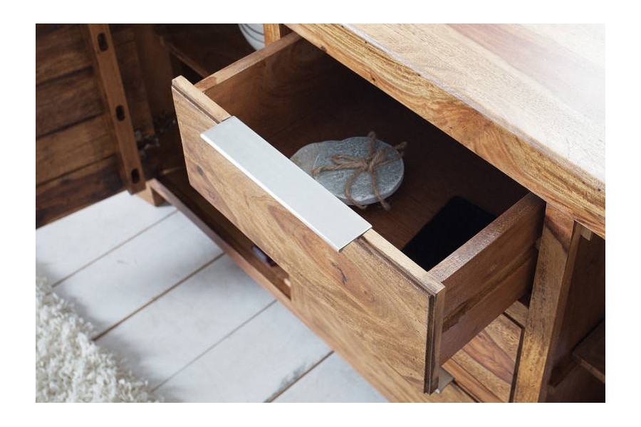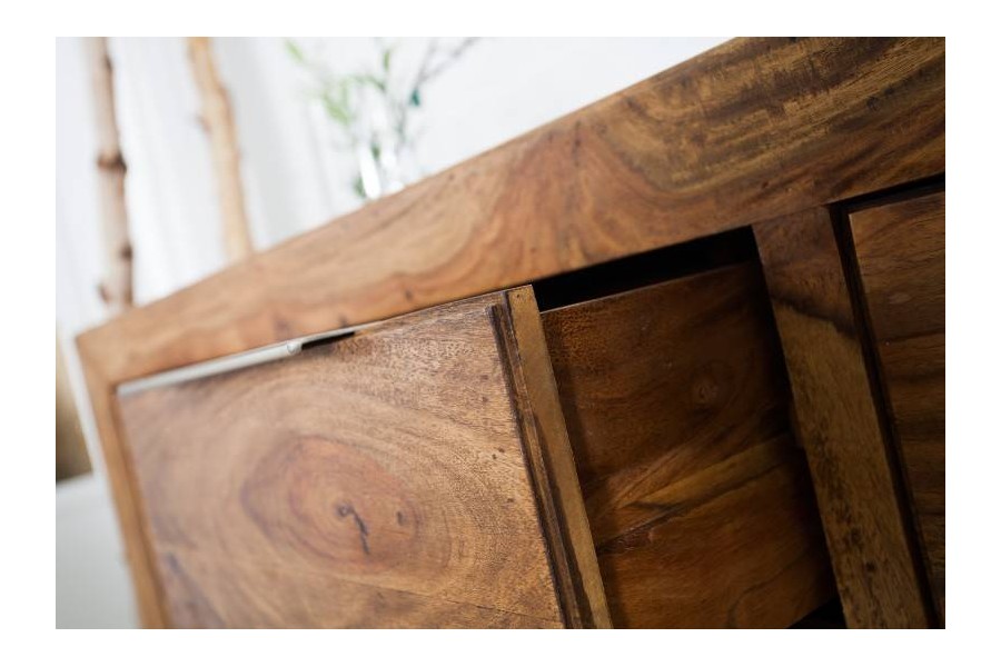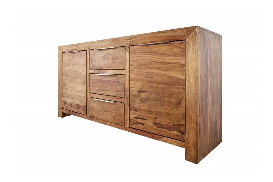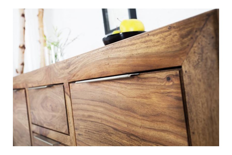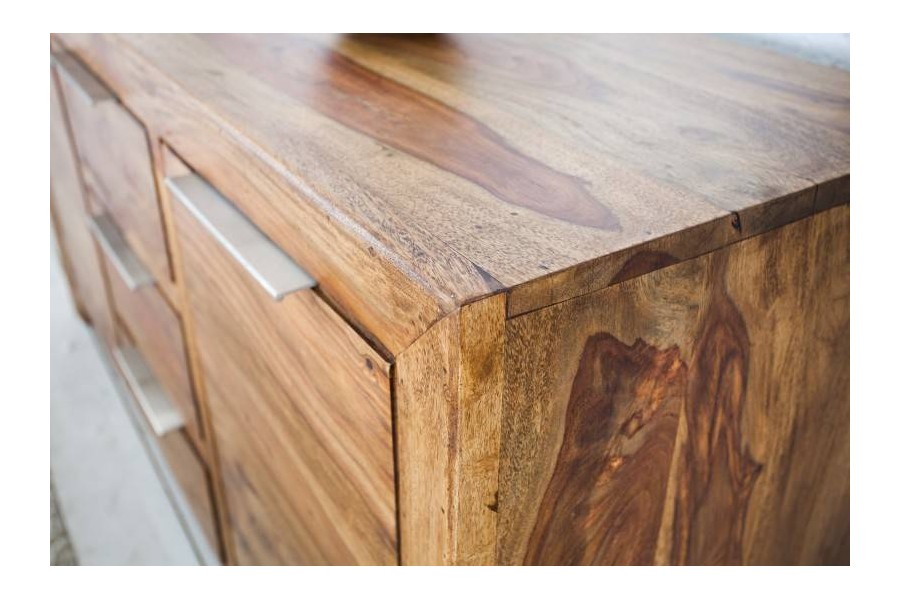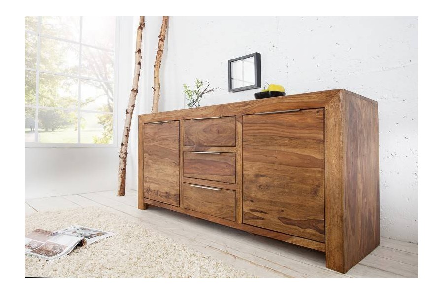 Un buffet en bois de palissandre naturel, avec 2 portes, 3 tiroirs, et des poignées en métal parfait pour un intérieur moderne.