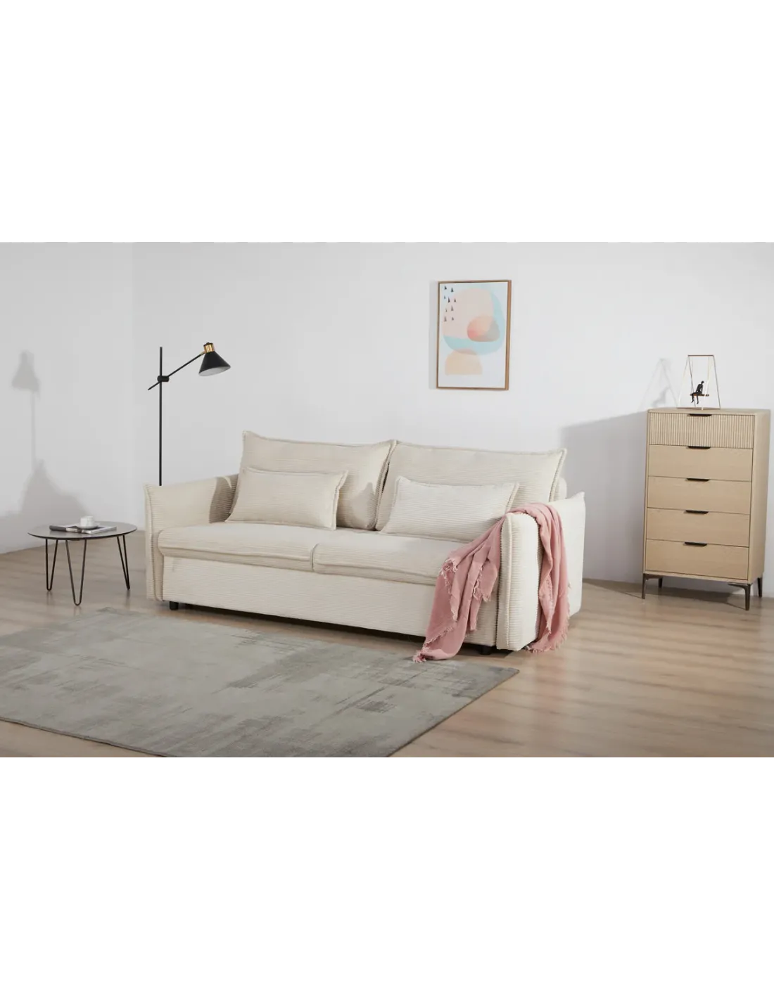 Avec son tissu cordon beige élégant et intemporel, ce canapé-lit séduit par sa polyvalence et son design raffiné. Parfait pour les moments de détente comme pour héberger vos invités, il combine confort quotidien, praticité et esthétisme pour sublimer votre salon.