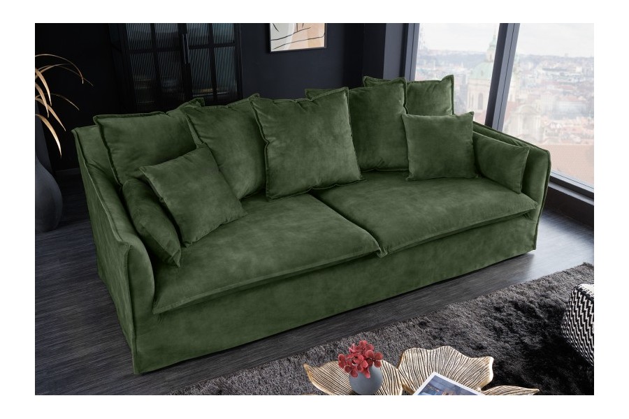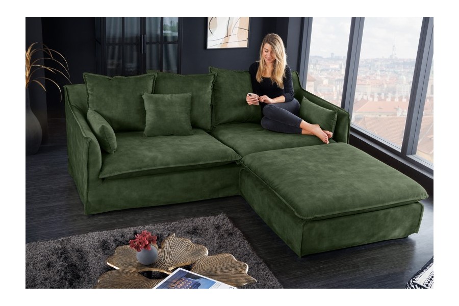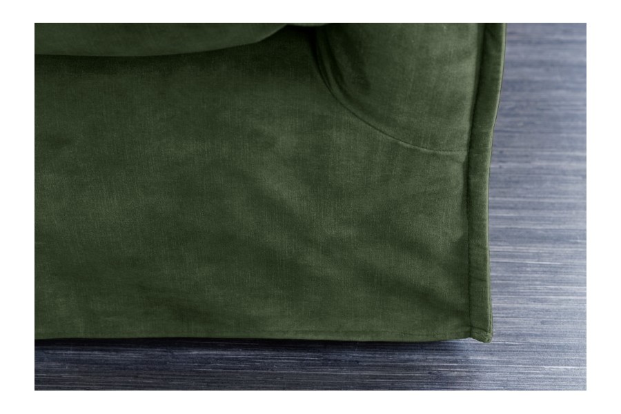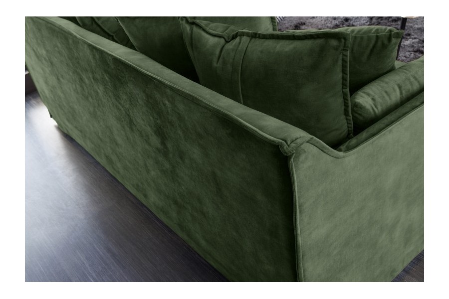 Matériaux haut de gamme : revêtement en velours vert foncé (100 % polyester), cadre robuste en bois de peuplier et rembourrage à ressort Nosag pour une durabilité optimale.