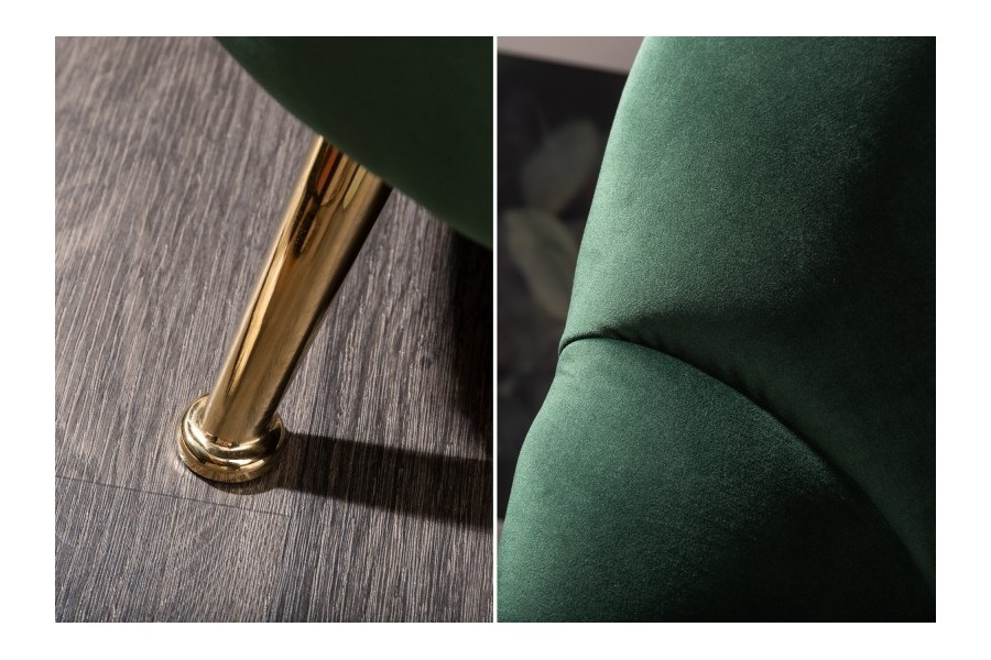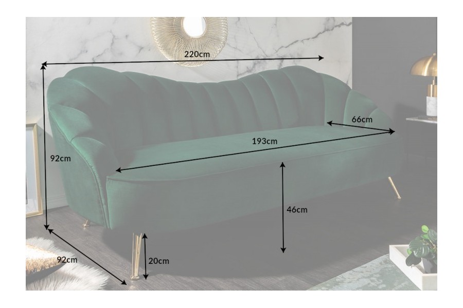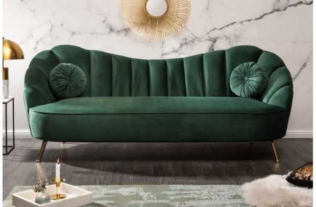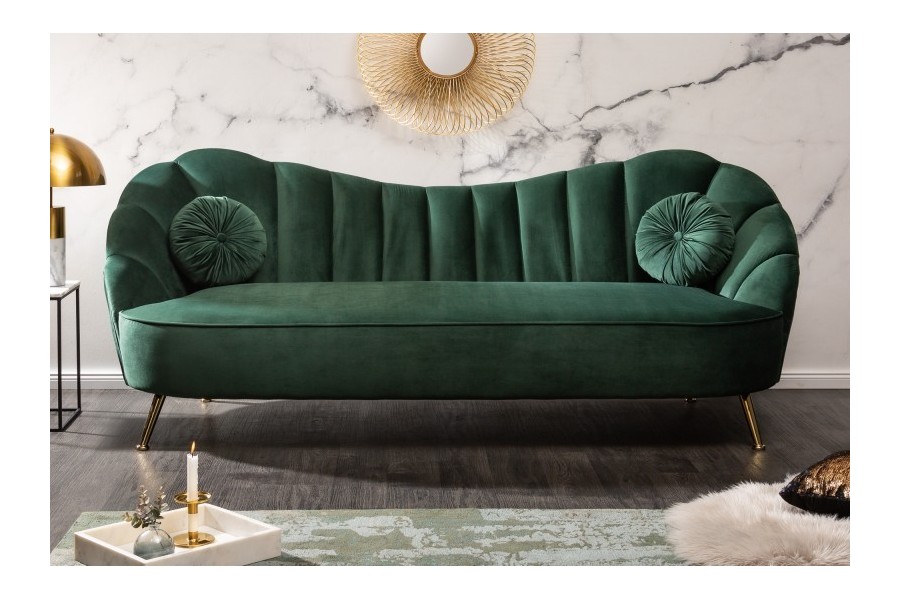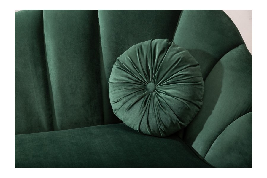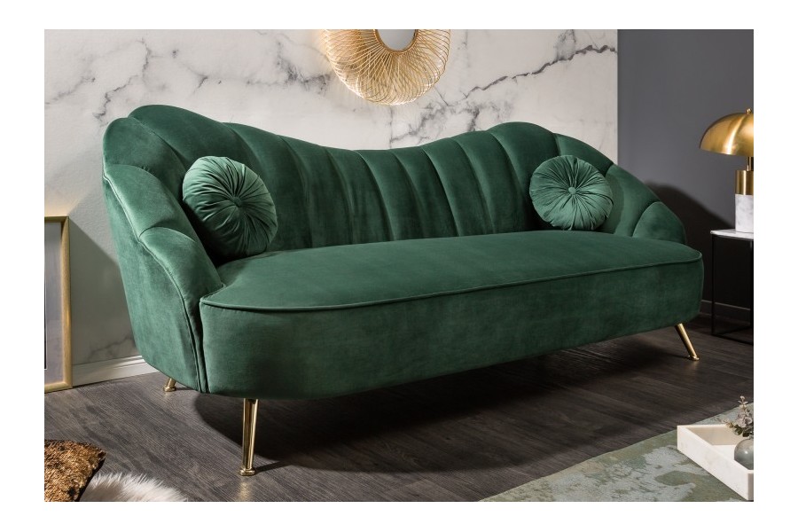 Canapé de forme coquillage, revêtu en velours de couleur vert bouteille est un bon investissement pour votre salon. Dont le style retro et le velours sont très tendance de nos jours. Ce meuble confortable a une structure en bois massif et possède un socle en acier teinté or qui vous garantie la durabilité du canapé, de plus le tissu utilisé est très agréable et doux qui vous donne le sentiment d'un toucher "peau de pèche".