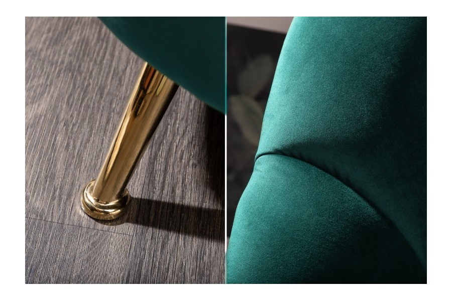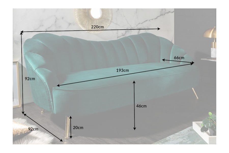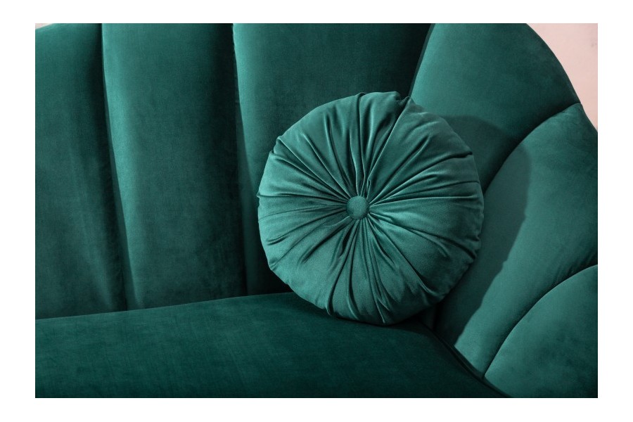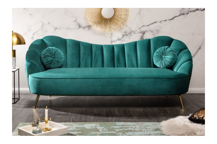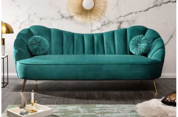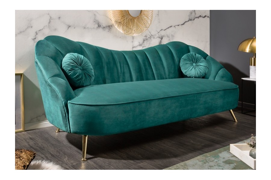Canapé de forme coquillage, revêtu en velours de couleur turquoise est un bon investissement pour votre salon. Dont le style retro et le velours sont très tendance de nos jours. Ce meuble confortable a une structure en bois massif et possède un socle en acier teinté or qui vous garantie la durabilité du canapé, de plus le tissu utilisé est très agréable et doux qui vous donne le sentiment d'un toucher "peau de pèche".