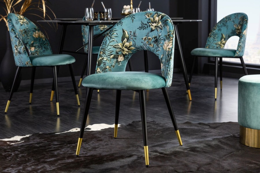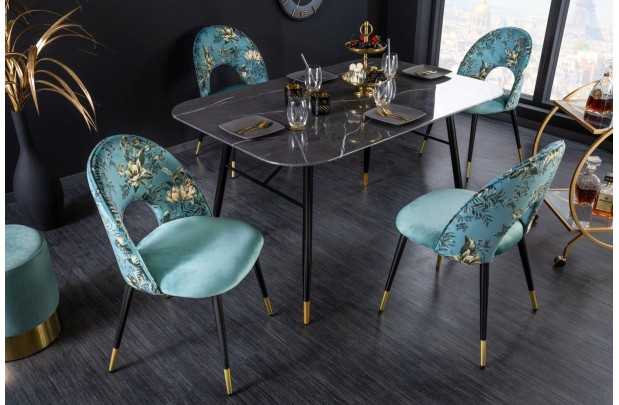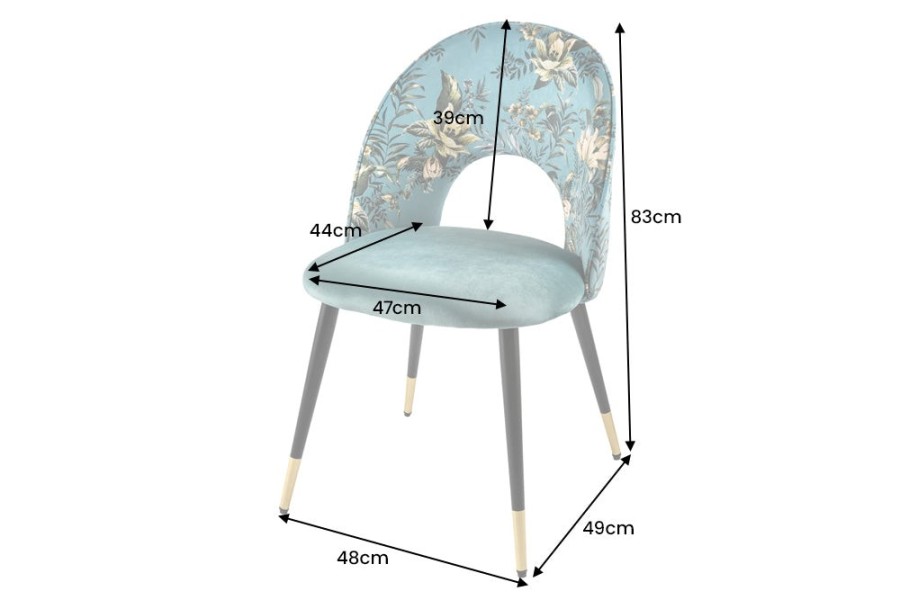 Design et Confort : Cette chaise combine parfaitement l'élégance classique et le confort moderne. Le revêtement en velours gris, rehaussé d'un motif floral, ajoute une touche de sophistication à n'importe quelle pièce. Les pieds en métal noir, ornés de patins dorés, apportent un contraste chic et assurent une stabilité optimale. Avec son dossier de 39 cm, cette chaise offre un excellent soutien pour une assise prolongée.