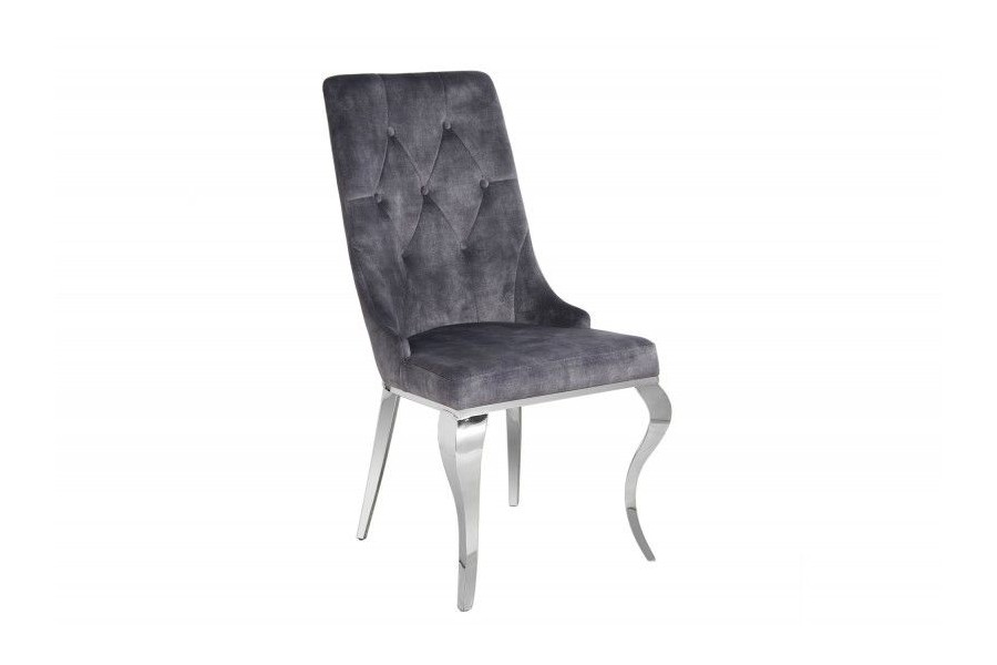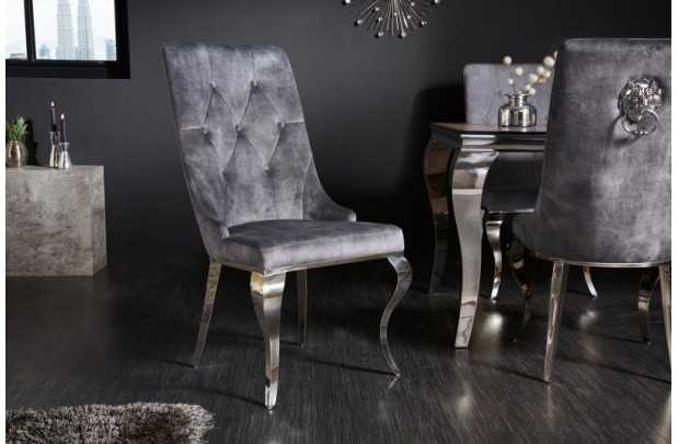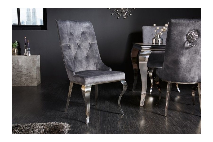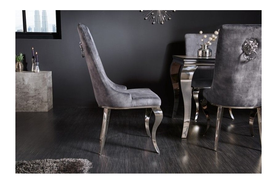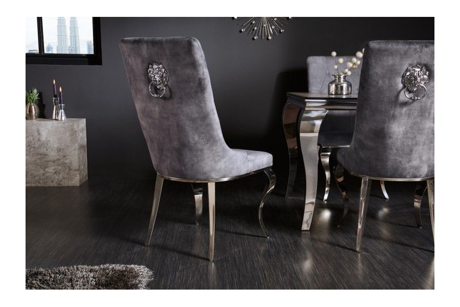 Commandez dès maintenant : Transformez votre intérieur avec cette chaise baroque en velours gris, dotée de pieds chromés et d'une poignée en forme de tête de lion. Alliant confort et esthétique, elle est prête à devenir la pièce maîtresse de votre décoration. Commandez dès aujourd'hui et apportez une touche de luxe et de sophistication à votre maison.