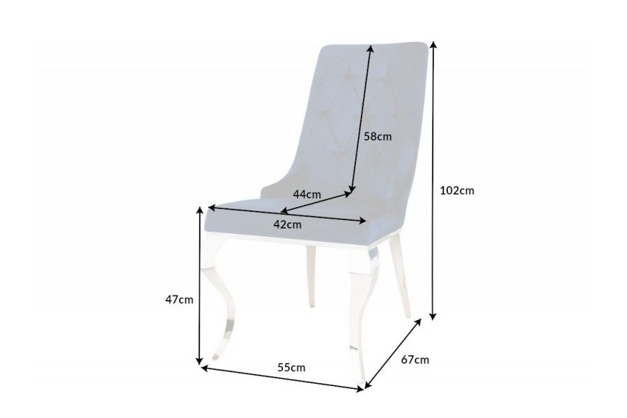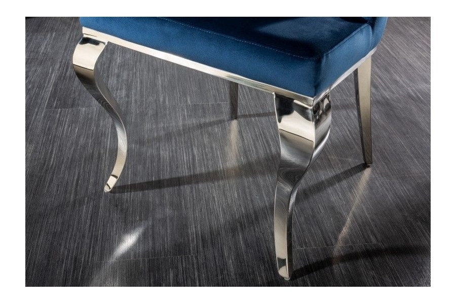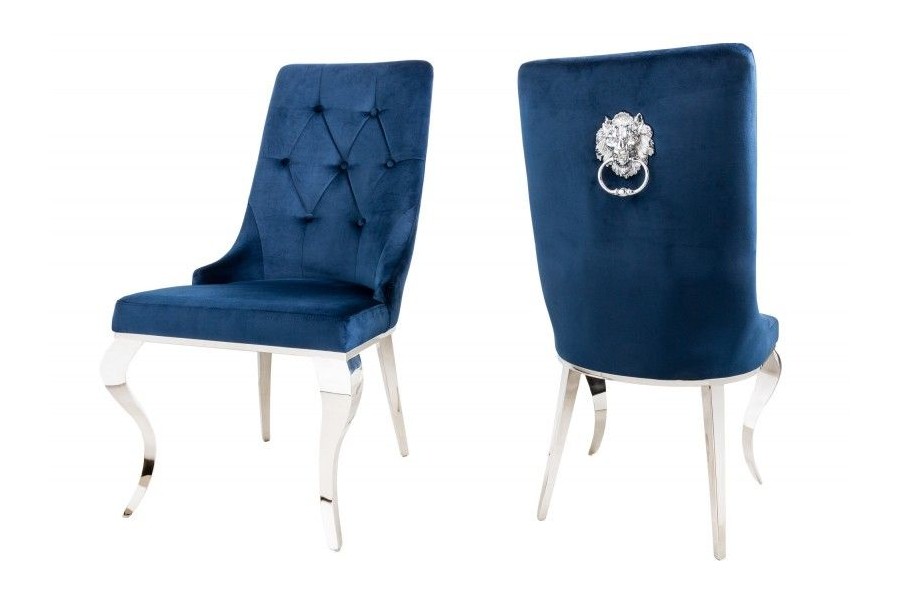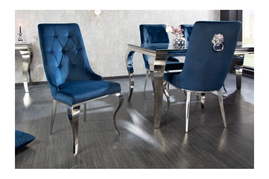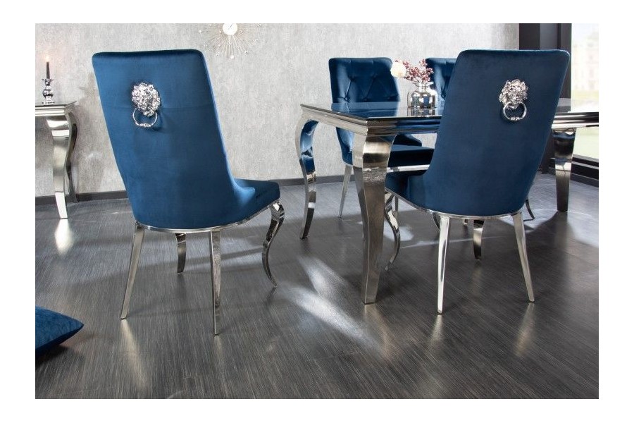 Design et Confort : Cette chaise incarne le style baroque avec une touche moderne. Le revêtement en velours bleu royal de haute qualité offre une sensation de luxe et de confort. Les pieds en acier inoxydable brillant et la poignée en forme de tête de lion argentée ajoutent une note distinctive et élégante, parfaite pour un intérieur sophistiqué. La chaise est non seulement esthétiquement plaisante mais aussi confortable grâce à son dossier haut de 60 cm et son assise bien proportionnée.