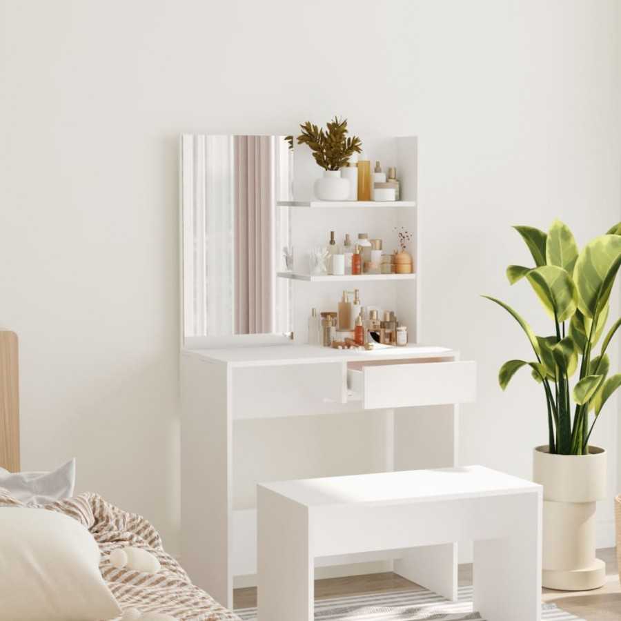 Avec ses lignes droites raffinées et sa forme asymétrique pleine d'originalité, cette coiffeuse ne manquera pas de faire tourner les têtes ! Matériau stable : le bois d'ingénierie est d'une qualité exceptionnelle avec une surface lisse et présente également résistance, stabilité et résistance à l'humidité.Miroir utilitaire : la table de maquillage avec miroir est parfaite pour votre routine beauté quotidienne. Le miroir vous permet de prendre soin de la peau de votre visage et de vous maquiller aussi !Grand espace de rangement : le dessus de la coiffeuse, les étagères à deux niveaux sur la table et un tiroir sous la table offrent suffisamment d'espace pour un accès facile à vos produits de maquillage, bijoux et essentiels de tous les jours.Design moderne : le design moderne présente des lignes épurées et des looks minimalistes dans le cadre du style de design d'intérieur. Avertissement :Afin d'éviter qu'il ne bascule, ce produit doit être utilisé avec le dispositif de fixation murale fourni. Remarque :Chaque produit est livré avec un manuel de montage dans la boîte pour un montage facile.