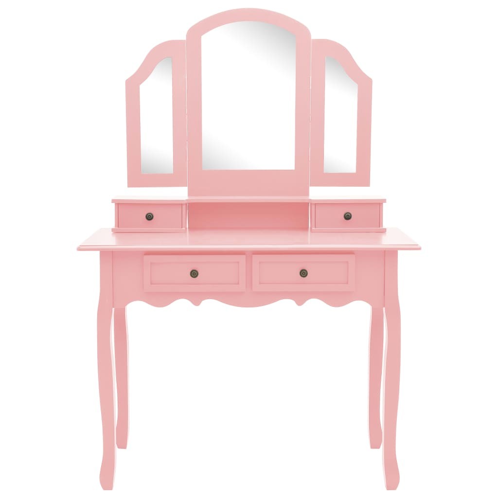 Notre ensemble charmant de coiffeuse et de tabouret est fabriqué en bois de paulownia de haute qualité. Son style victorien et sa finition rose épurée sont conçus pour apporter de l'élégance et de la beauté à votre boudoir, salon personnel ou vestiaire. La finition exquise est une caractéristique exceptionnelle ajoutée de cet ensemble de table et de tabouret. Cette table de maquillage comprend un miroir de table 3 en 1, dont 2 miroirs latéraux sont pliables avec des charnières durables. Vous pouvez également les tourner à l'angle souhaité. Étonnamment, le cadre du miroir et la table peuvent être utilisés séparément. De plus, les 4 tiroirs chics vous offrent un espace supplémentaire pour vos ornements, cosmétiques et autres articles essentiels. Cet ensemble de table et de tabouret cosmétique attire certainement le regard, dans n'importe pièce.