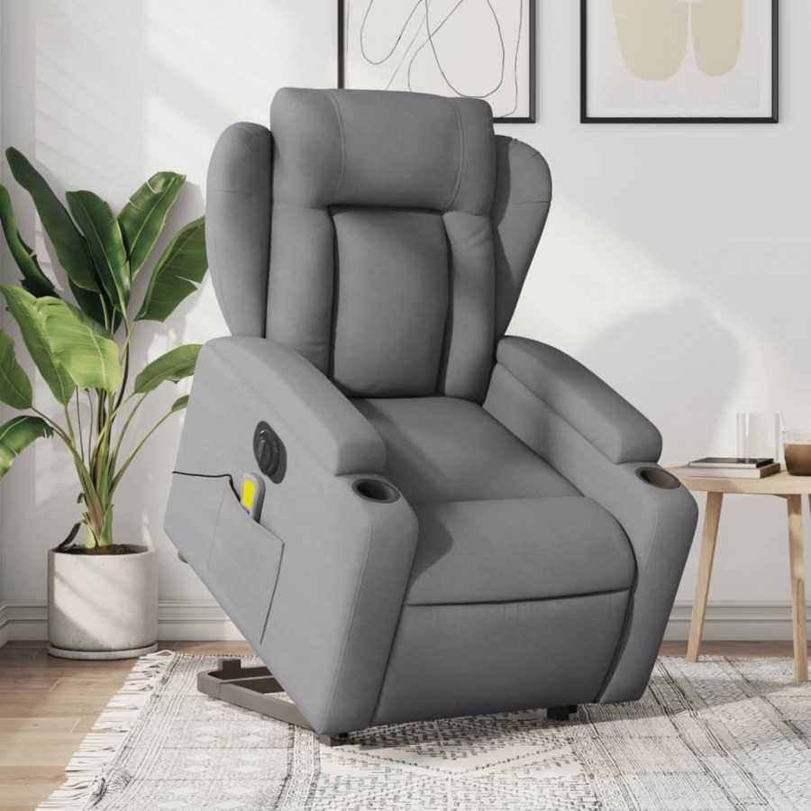 Asseyez-vous et détendez-vous dans ce fauteuil inclinable de massage électrique très confortable ! Fonction de levage électrique : ce fauteuil inclinable pour personnes âgées est équipé d'un moteur électrique pour la fonction de levage. Grâce à la fonction qui pousse toute la chaise vers le haut, vous pouvez facilement vous tenir debout sans stresser votre dos et vos genoux en appuyant simplement sur le bouton.Fonction d'inclinaison électrique : ce fauteuil inclinable est également équipé d'un moteur électrique qui permet de régler automatiquement le repose-pied et le dossier dans n'importe quelle position, selon votre confort, en appuyant simplement sur le bouton situé sur le côté du fauteuil. Cette fonction permet une inclinaison maximale de 135 degrés. En outre, le dossier peut revenir automatiquement à sa position d'origine par une simple pression sur le bouton.Fonction de vibration : les 6 points de massage vous permettent de faire l'expérience d'un massage mieux ciblé. De plus, la télécommande incluse vous permet de choisir différents programmes de massage. La fonction de massage est alimentée par le connecteur USB qui nécessite une source d'alimentation USB certifiée de 5 V (non fournie).Expérience d'assise confortable : le siège, le dossier et les larges accoudoirs bien rembourrés recouverts de tissu procurent une sensation confortable et chaleureuse, vous permettant de vous sentir enveloppé lorsque vous êtes assis. Le tissu présente un aspect simple et épuré et est respirant et durable.Porte-gobelets et poche latérale pratiques : ce fauteuil dispose de deux porte-gobelets pratiques pour vos boissons et d'une poche latérale pour garder vos objets essentiels à portée de main.Cadre solide et stable : le cadre en bois et en métal offre une structure solide et une grande stabilité. Ce fauteuil inclinable est confortable et durable.