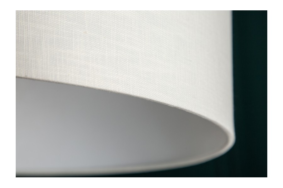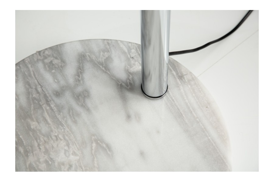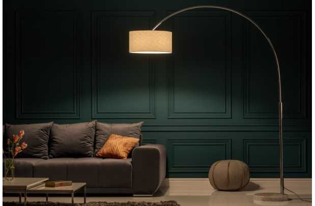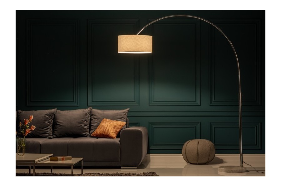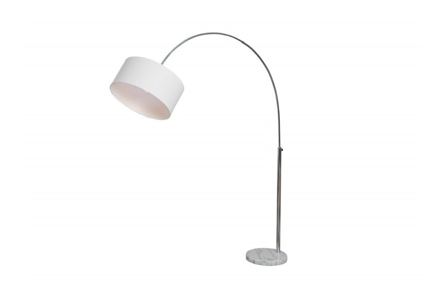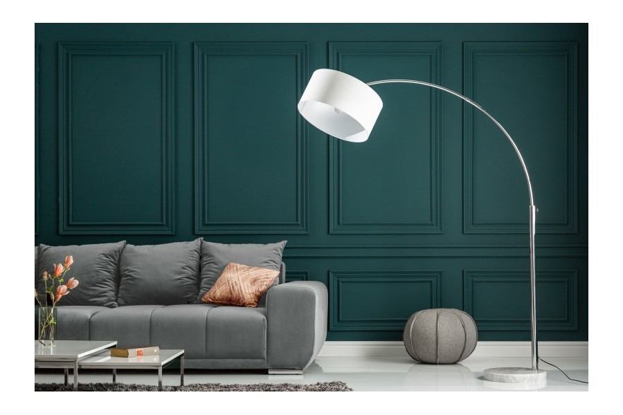 Splendide lampadaire blanc de design arqué avec un abat-jour de tissu toile de lin blanc, placé sur une base en marbre blanc ajoutera une touche distingué à votre intérieur.