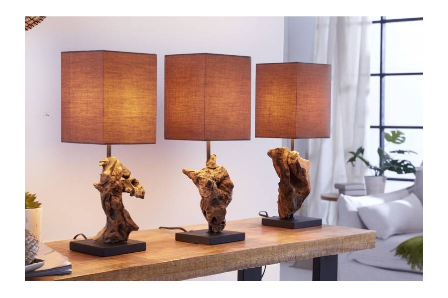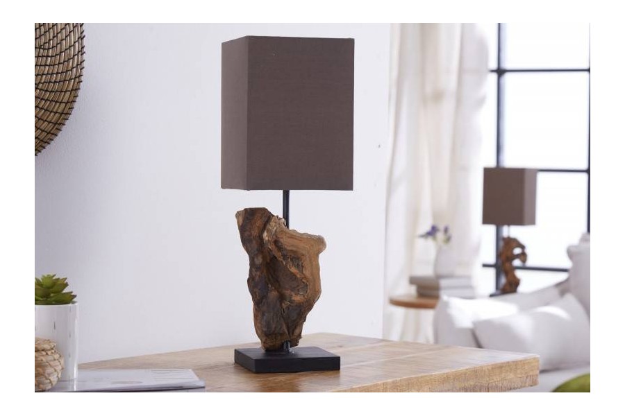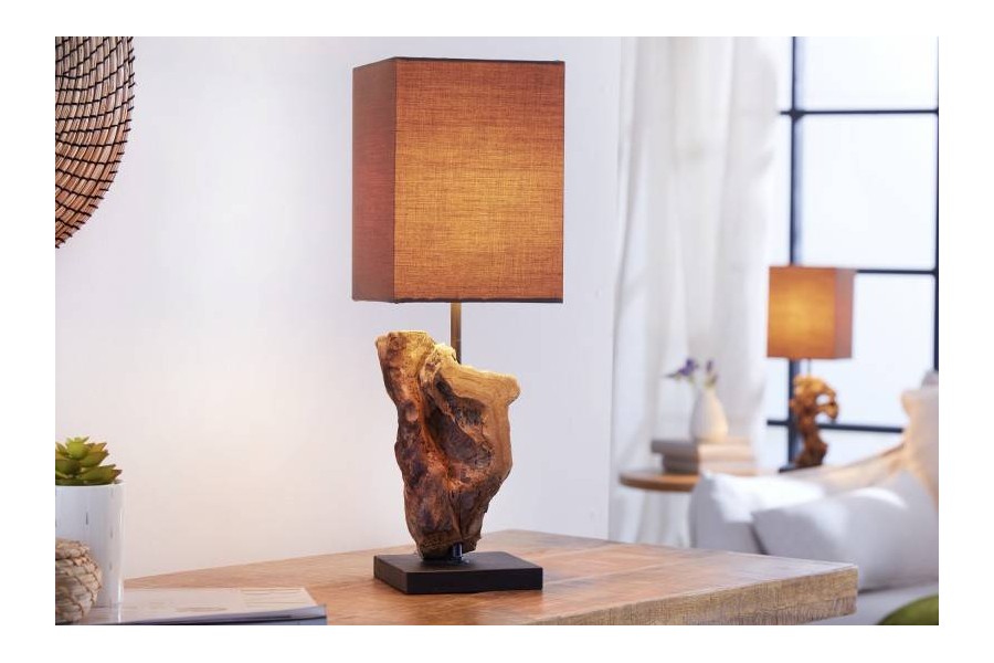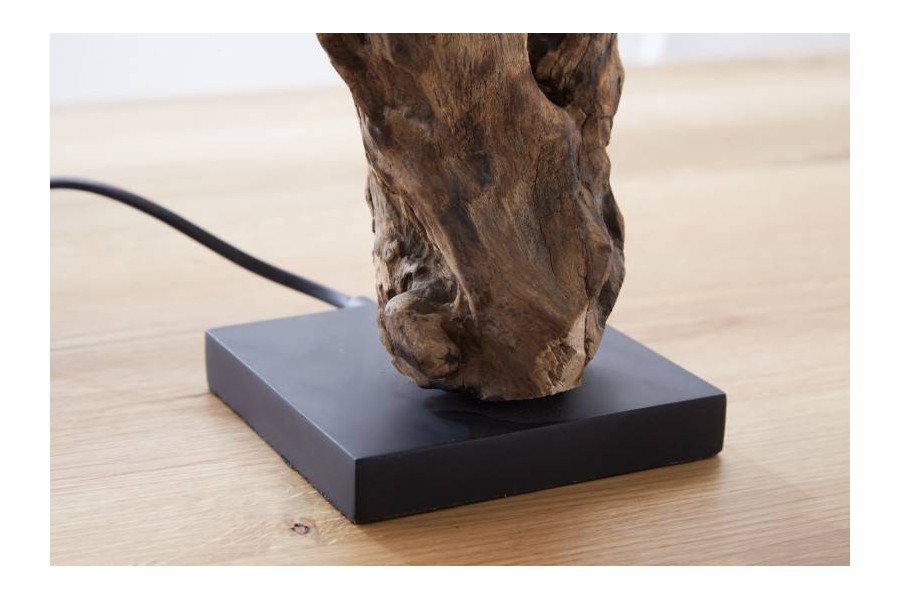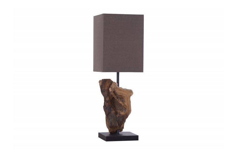 Magnifique lampe avec un abat-jour en tissu de lin marron et un socle carré en bois flotté artisanal, ajoutera une atmosphère naturelle et chic à votre intérieur.