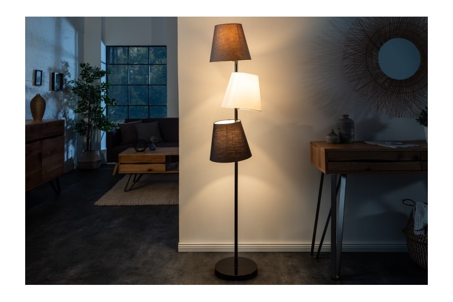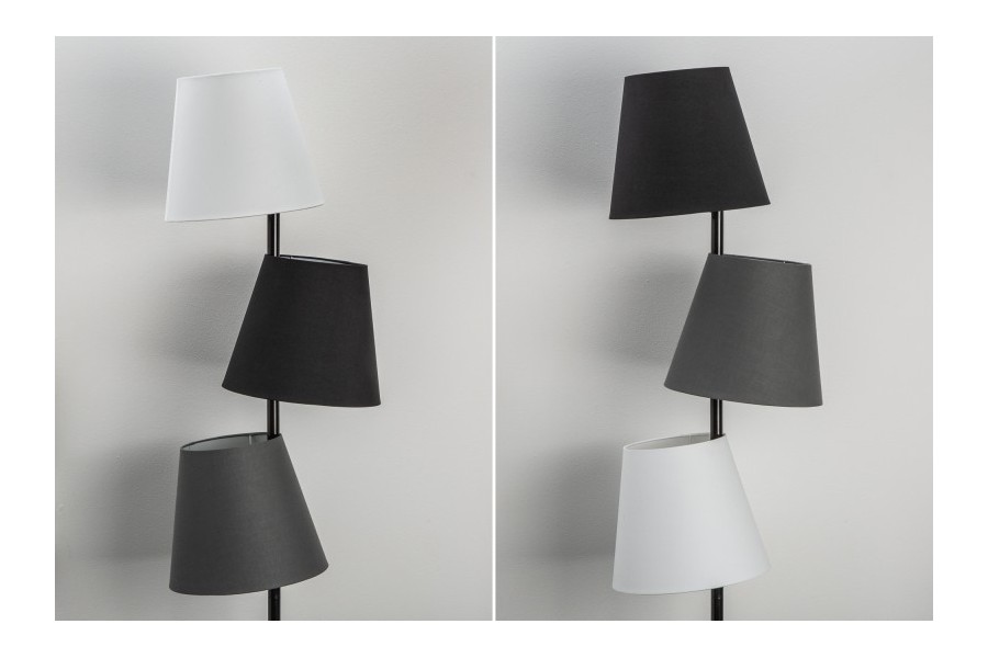 Elle se compose de 3 abat-jours nuancés noir, blanc et gris asymétriquement placés. Fabriqués en lin. Ils rayonnent d’un éclairage agréable dans l’espace et créent une atmosphère accueillante lorsqu’ils sont allumés. Les abat-jours changent en différentes nuances de marron, avec une teinte grise et noire élégante éteinte.