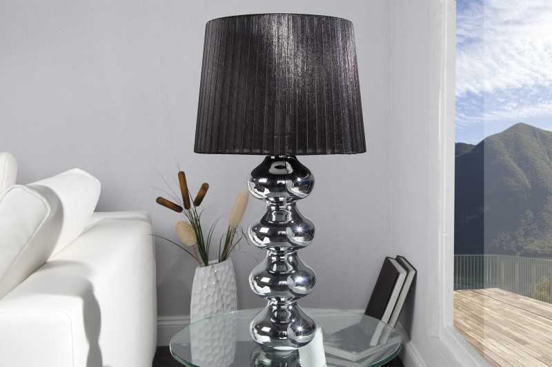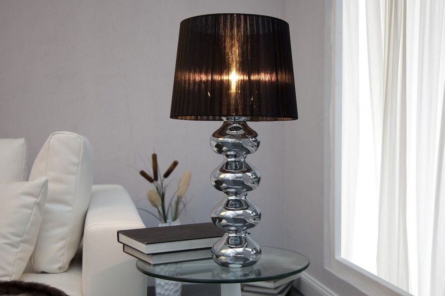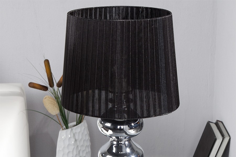 Splendide lampe en acier chromé avec un abat-jour en tissu noir, et un socle de haute qualité ajoutera un design luxueux et chic à votre intérieur.