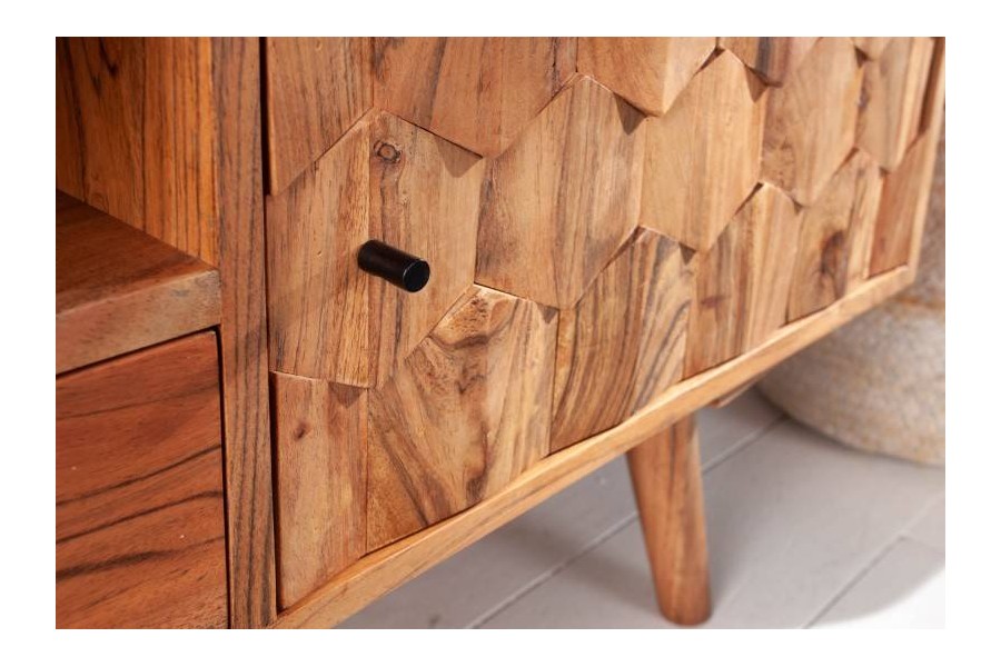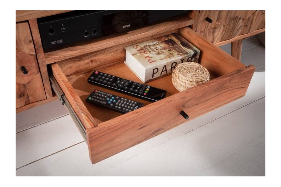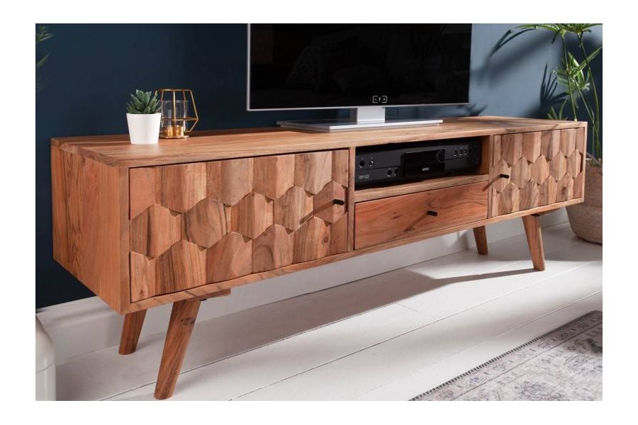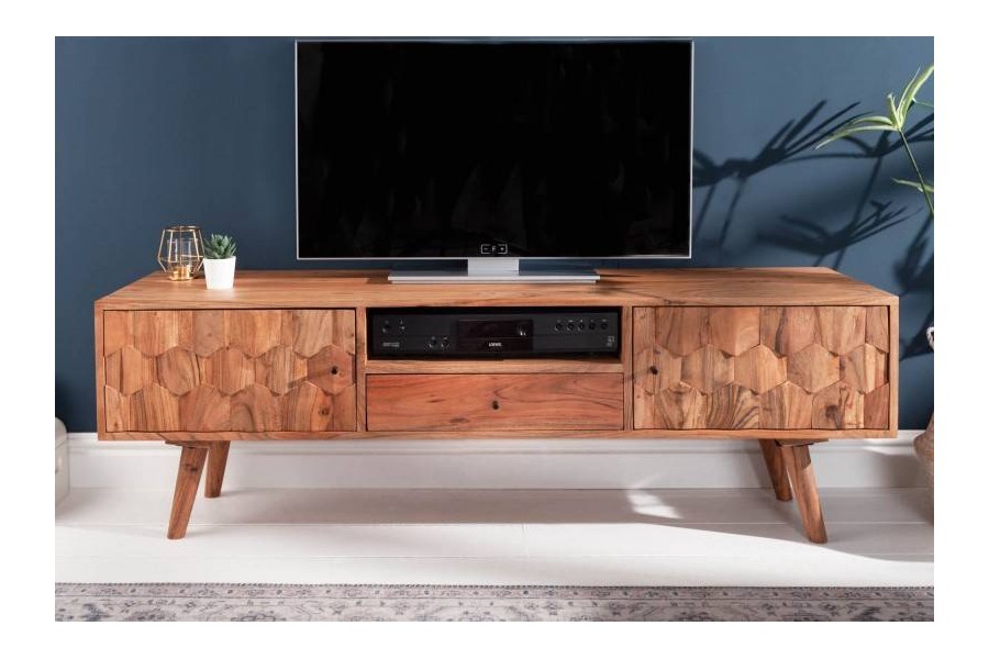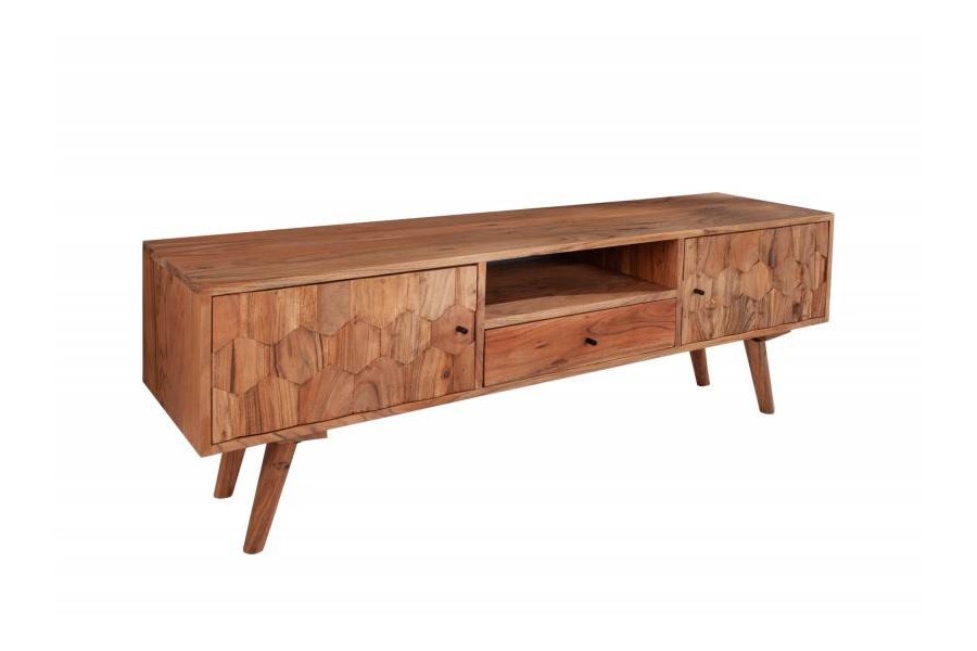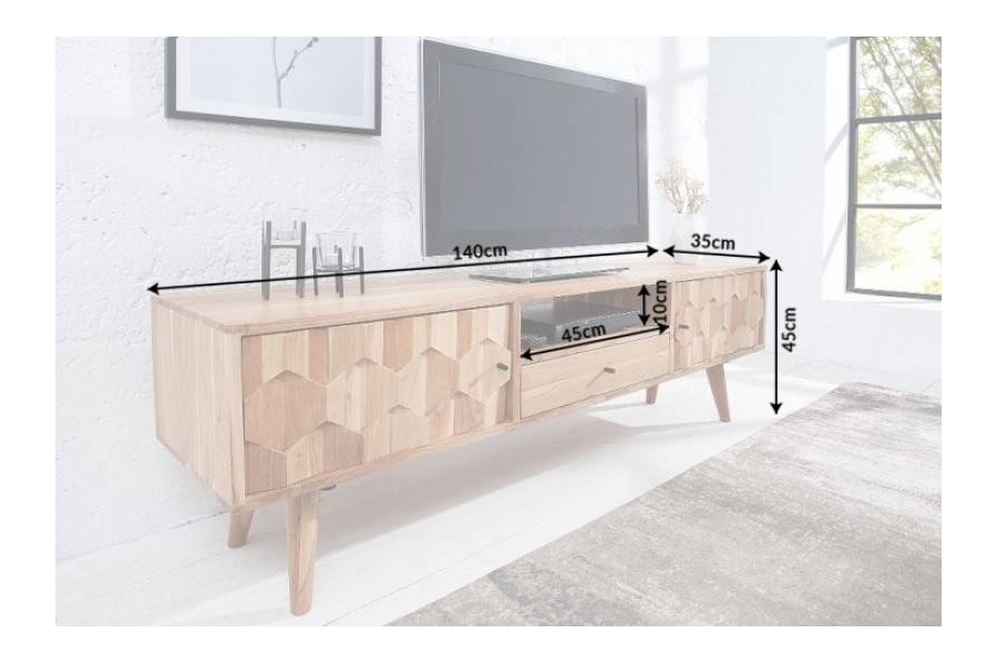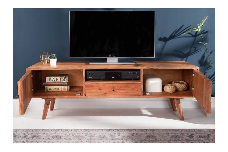 Meuble tv design scandinave coloris naturel en bois massif à 2 portes, une niche et un tiroir