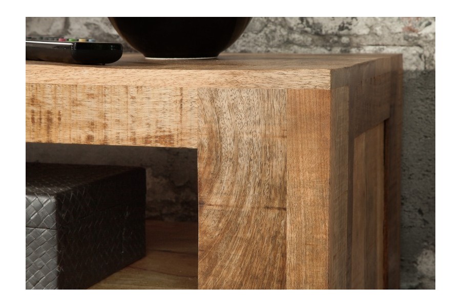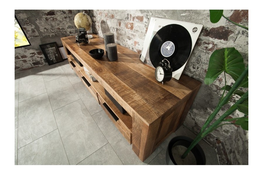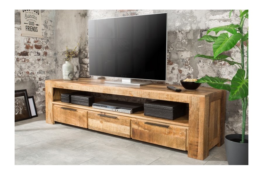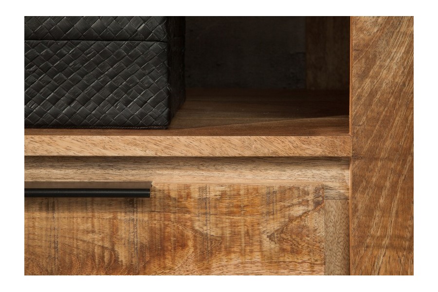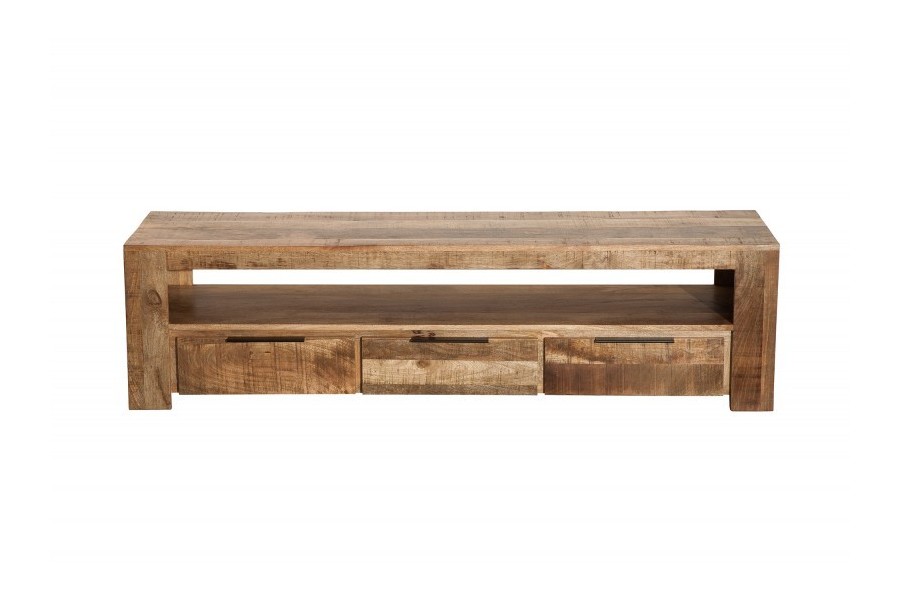 Ce meuble TV bois de manguier massif respire l'élégance naturelle ! Contenant un grand espace de rangement grâce au compartiment de rangement ouvert et aux trois tiroirs
