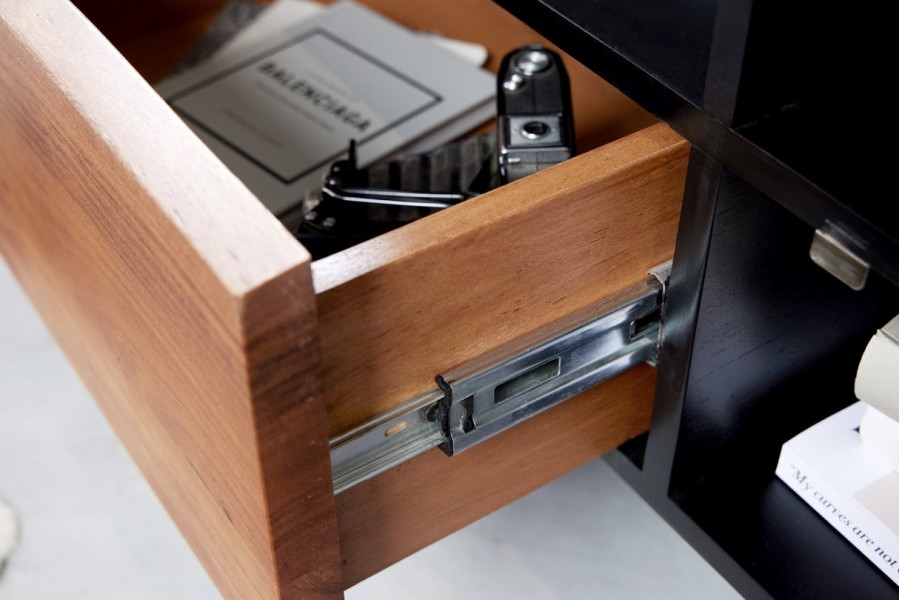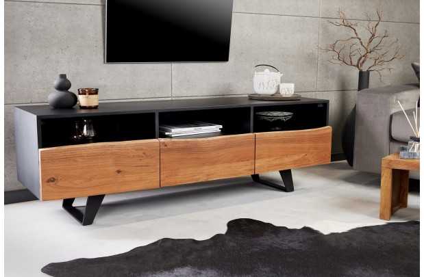 Design élégant et naturel : Les façades et le tiroir sont en acacia naturel, ajoutant une touche organique et chaleureuse à l’ensemble. Les variations naturelles du bois d'acacia, qui peuvent inclure des différences de couleur et de légères irrégularités, confèrent à chaque meuble un caractère unique et authentique.