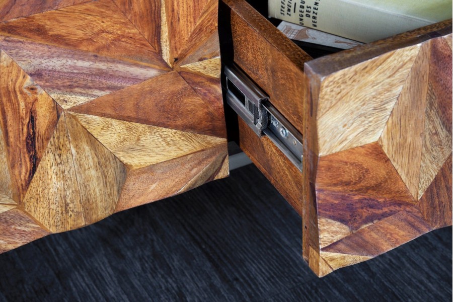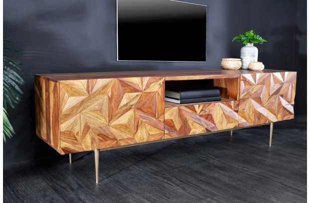 Ajoutez une touche de sophistication et d'originalité à votre espace de divertissement avec ce meuble TV en bois de Sesham. Son design de surface en 3D réalisé à la main et ses pieds dorés en font un choix exceptionnel pour une expérience multimédia élégante.