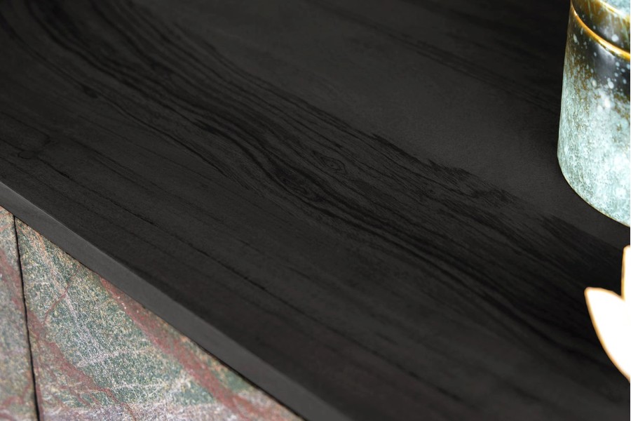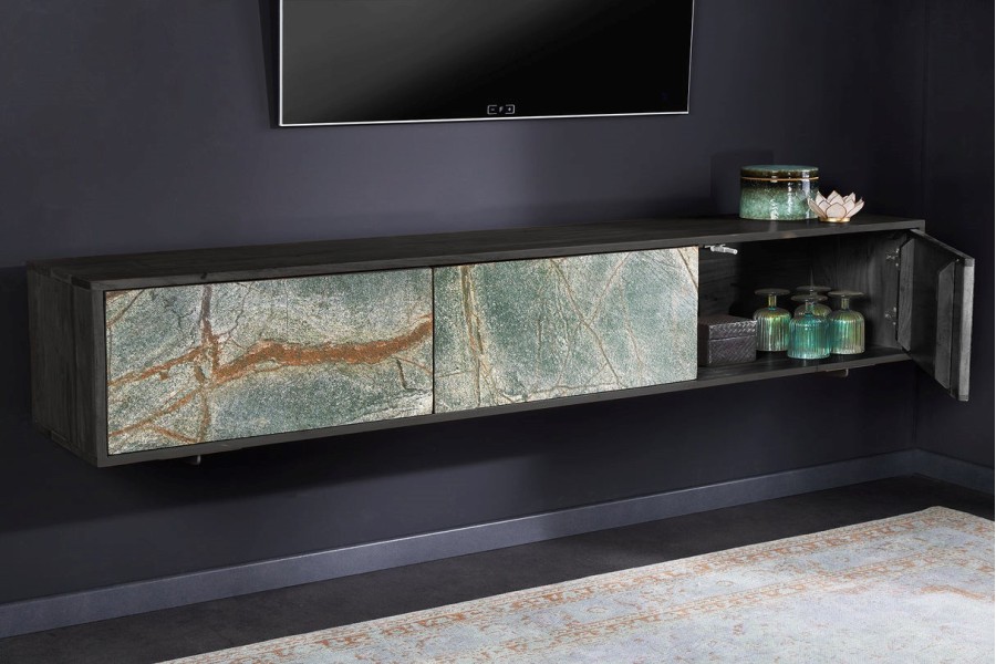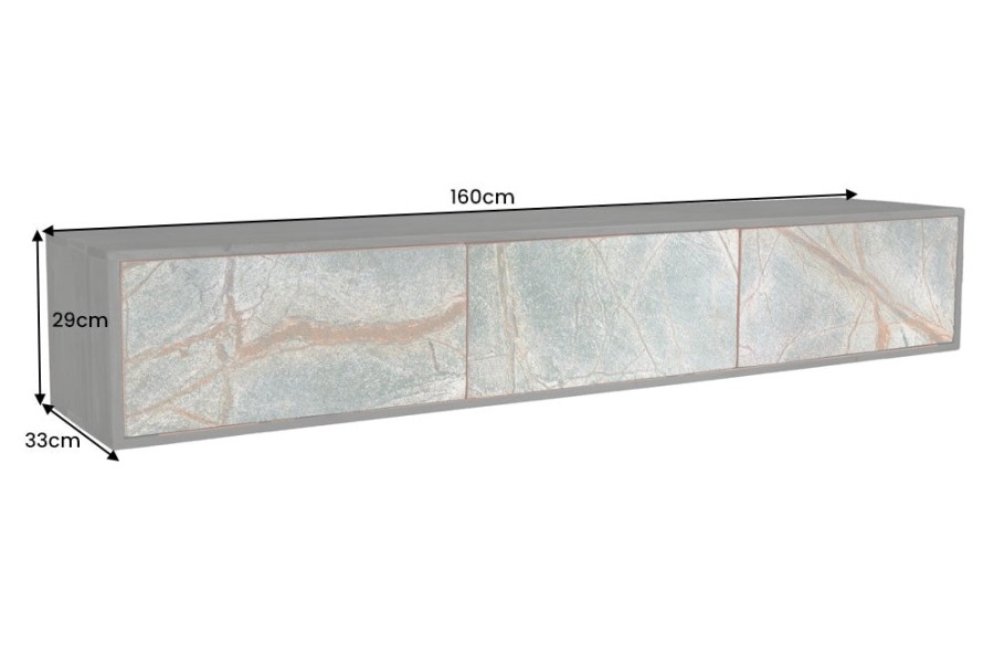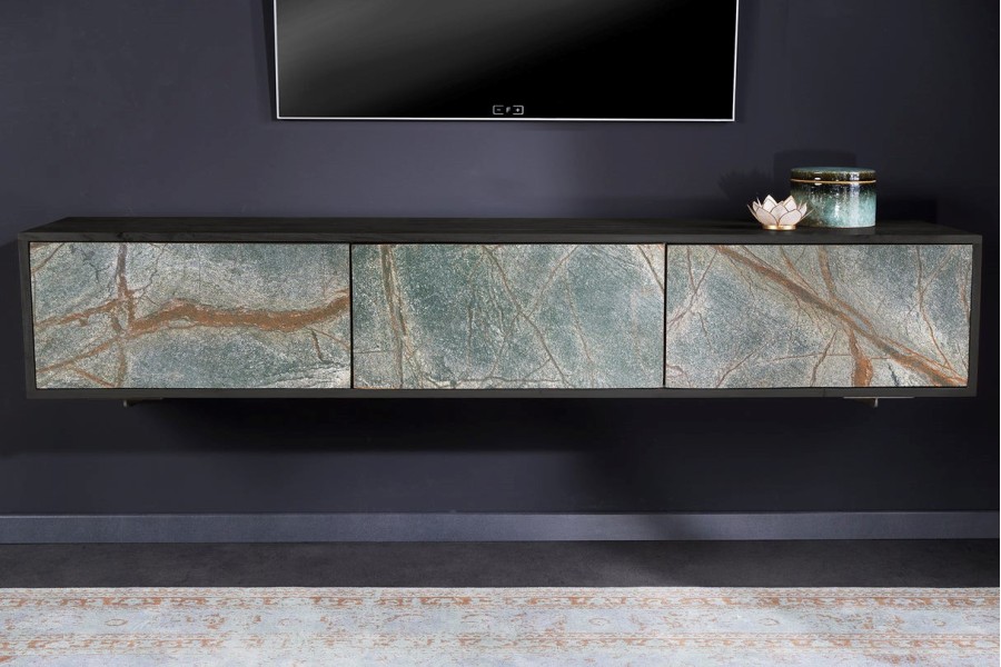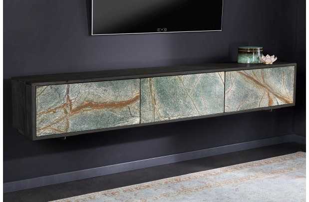 - Les façades en placage de pierre marbrée ajoutent une élégance unique à ce meuble TV.