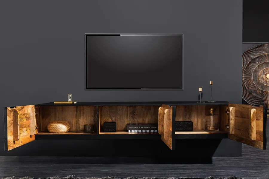 Rangement Fonctionnel : Doté de plusieurs compartiments dissimulés derrière des portes, le meuble offre un espace de rangement ample pour vos appareils électroniques, télécommandes, DVDs et autres accessoires multimédias. Les portes s’ouvrent facilement pour un accès pratique tout en maintenant une apparence épurée.