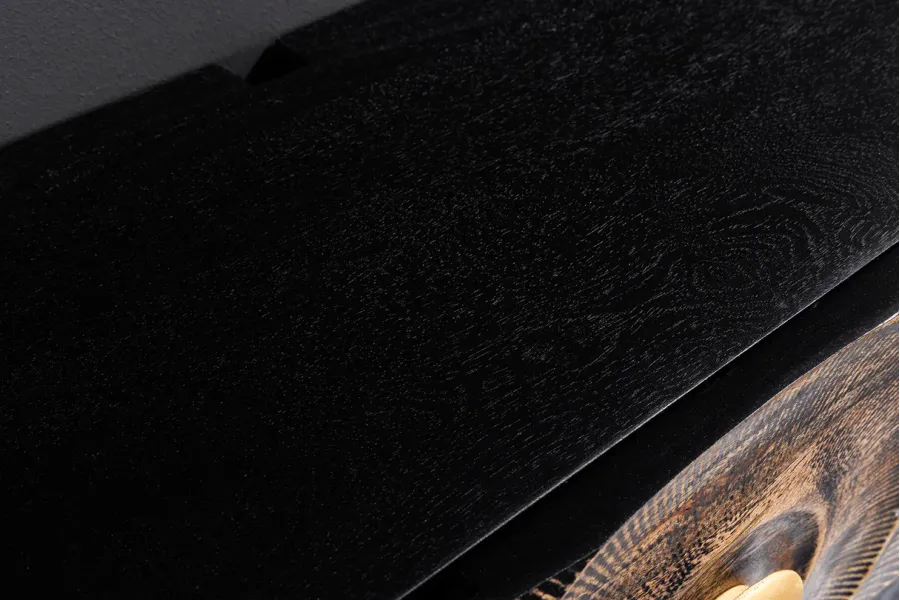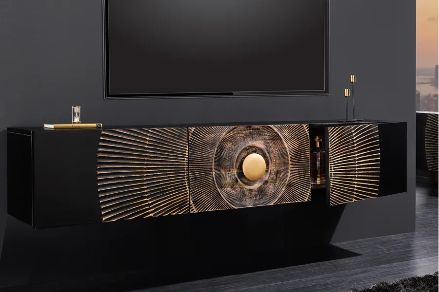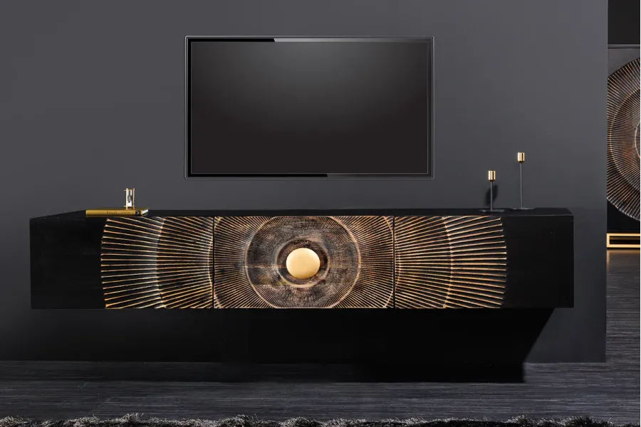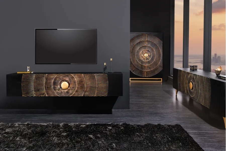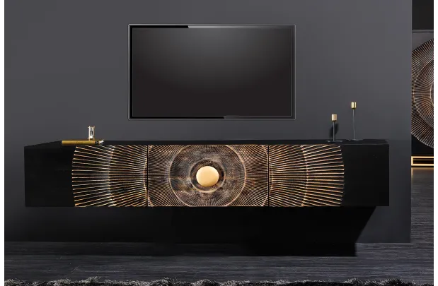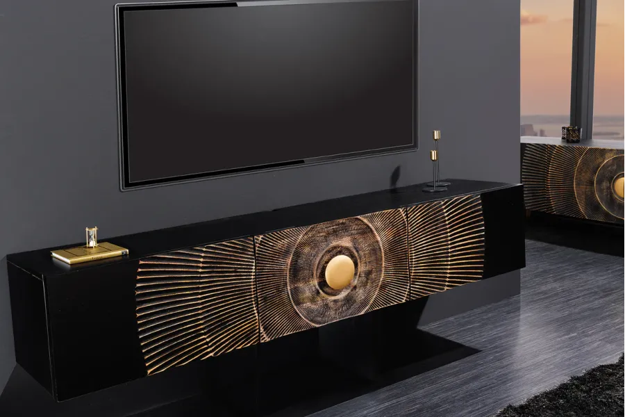 Design Artistique : Le meuble TV présente un design unique avec un motif en relief doré sur un fond noir, créant un effet visuel saisissant et luxueux. Le motif rayonnant centré autour d’un cercle doré attire immédiatement l’attention et ajoute une dimension artistique à votre espace.