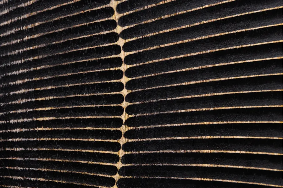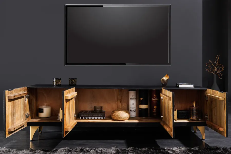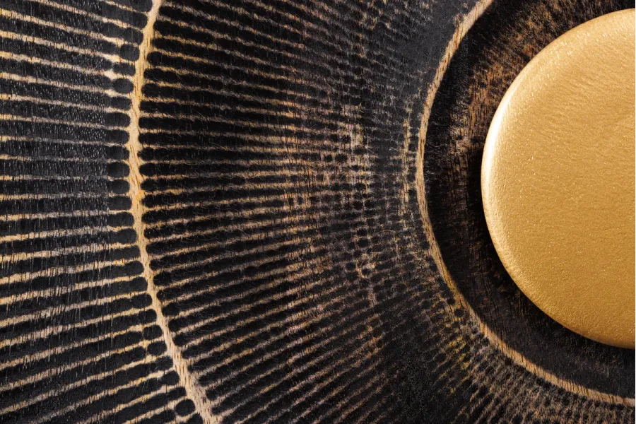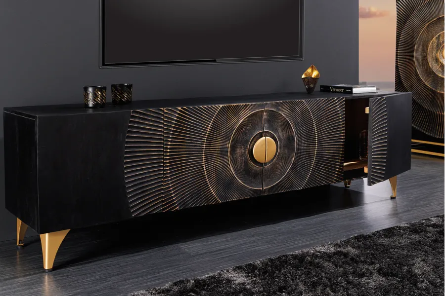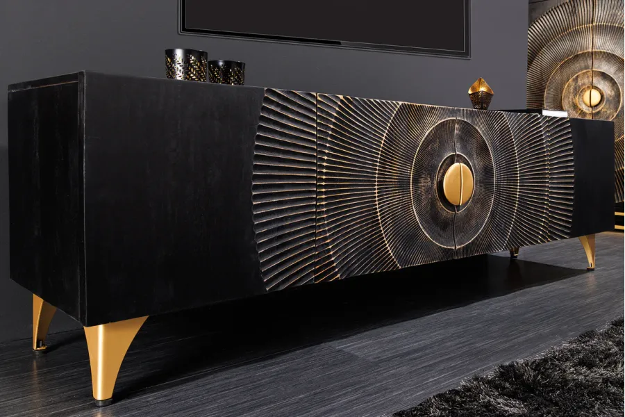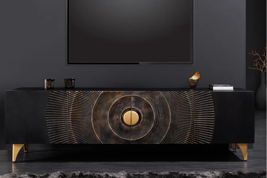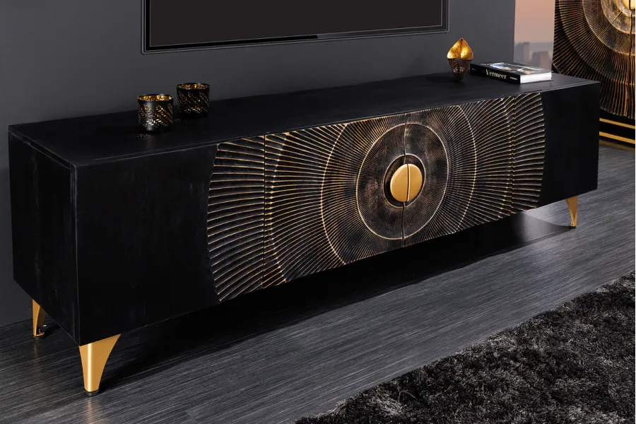 Design Artistique : Le meuble TV présente un design unique avec un motif en relief doré sur un fond noir, créant un effet visuel saisissant et luxueux. Le motif rayonnant centré autour d’un cercle doré attire immédiatement l’attention et ajoute une dimension artistique à votre espace.