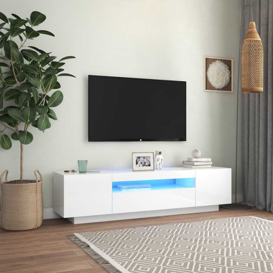 Avec un design à la fois tendance et pratique, ce meuble TV avec éclairage LED deviendra certainement un point central de votre pièce. La construction robuste de l'armoire HiFi la rend très durable. Il vous reste amplement d'espace pour garder votre lecteur DVD, votre console de jeu, votre appareil de streaming et vos supports multimédias bien organisés. Ce meuble TV est doté de lumières LED RVB, qui ont différents menus pour changer la couleur des lumières et laisser la couleur s'ajuster automatiquement. Les lumières LED soulignent l'aspect moderne et contribuent à la sensation de tendance. De plus, ce meuble TV est facile à nettoyer avec un chiffon humide. Remarque : ce produit est doté d'un connecteur USB, mais la source d'alimentation certifiée de USB n'est pas incluse.