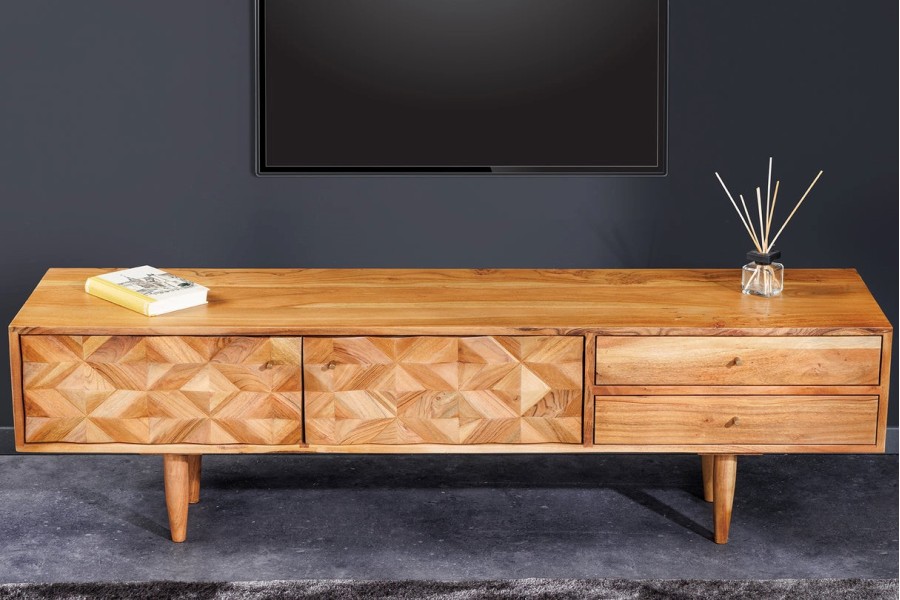 - Bois massif d'acacia : Ce matériau est reconnu pour sa robustesse et sa durabilité, garantissant que votre meuble TV résistera à l'épreuve du temps tout en conservant son aspect luxueux.