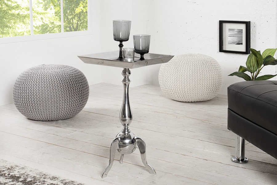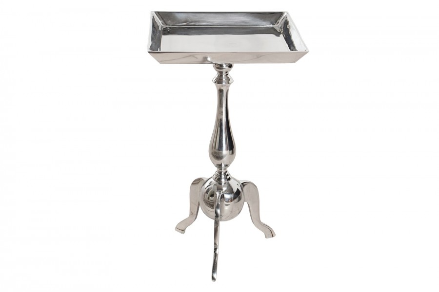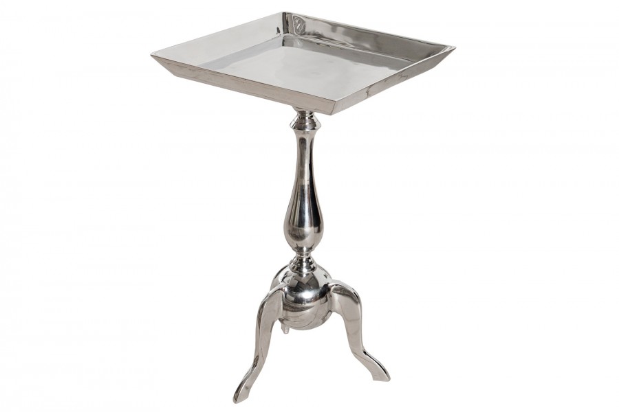 Excellente table d’appoint carrée coloris argenté ! Fabriquée en aluminium de haute qualité et composée de 3 pieds au bout d’une seule tige aux moulures un peu arrondies. Elle très pratique et élégante avec un design baroque pur et authentique et un coloris argenté chaud et charmant ! Elle est parfaite pour salon, un réveil, et un chargeur de téléphone !
