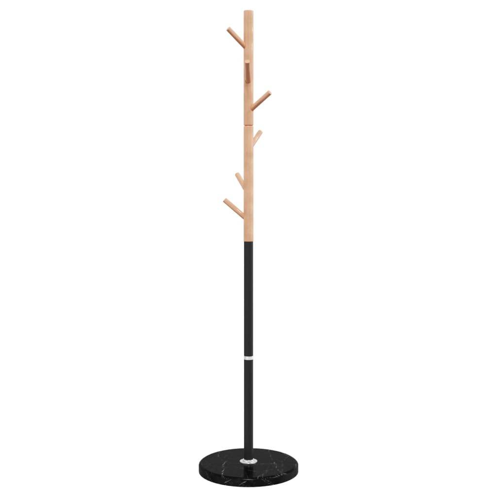 Ce porte-manteau pratique vous permettra d'organiser vos affaires et de les rendre facilement accessibles ! Cadre stable et robuste : le fer est un matériau solide et dur. C'est un solide favori dans la construction industrielle et la fabrication de meubles. Le bois de hêtre a un grain droit et est très durable. Fabriqué en fer et en bois de hêtre, ce porte-manteau est robuste et durable.Espace de rangement suffisant : le cintre comprend 6 patères de rangement pour offrir beaucoup d’espace pour accrocher des articles, notamment des vêtements, des sacs, des chapeaux, etc. Avec les patères à différents niveaux, le support aide à ranger vos affaires de manière ordonnée.Base robuste : la base est en marbre, elle est donc suffisamment lourde pour que le porte-manteau reste stable.Nombreuses applications : ce porte-manteau sur pied pratique est parfait pour être placé dans le couloir, le salon, la chambre à coucher ou tout autre endroit où vous avez besoin d'être mieux organisé pour garder votre maison propre et bien rangée ! Bon à savoir :Chaque base en marbre a un motif unique. La livraison est aléatoire, ce qui garantit l'exclusivité et l'individualité de votre produit.
