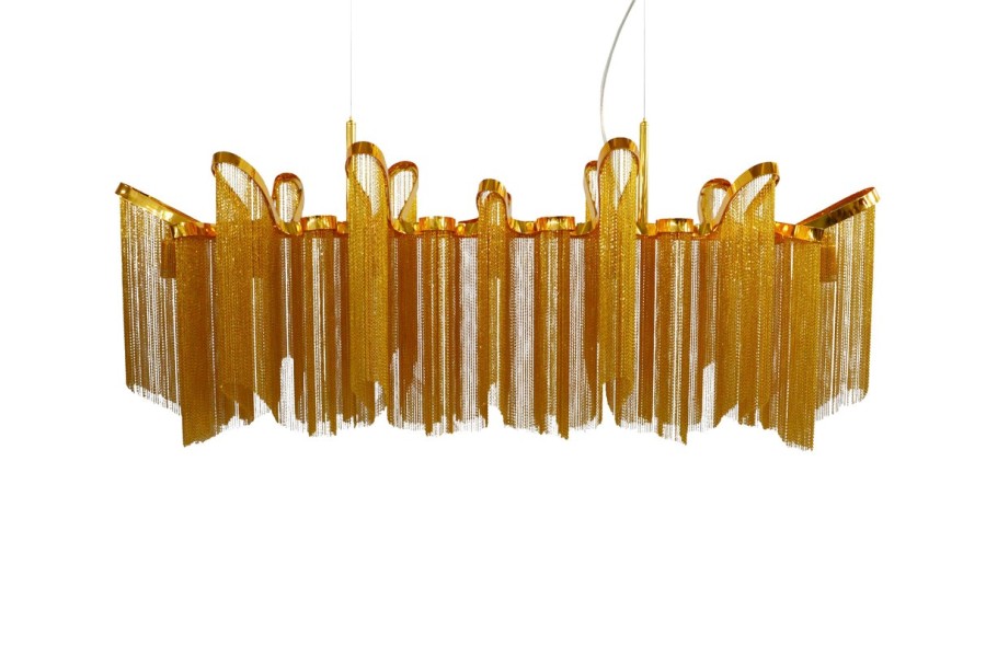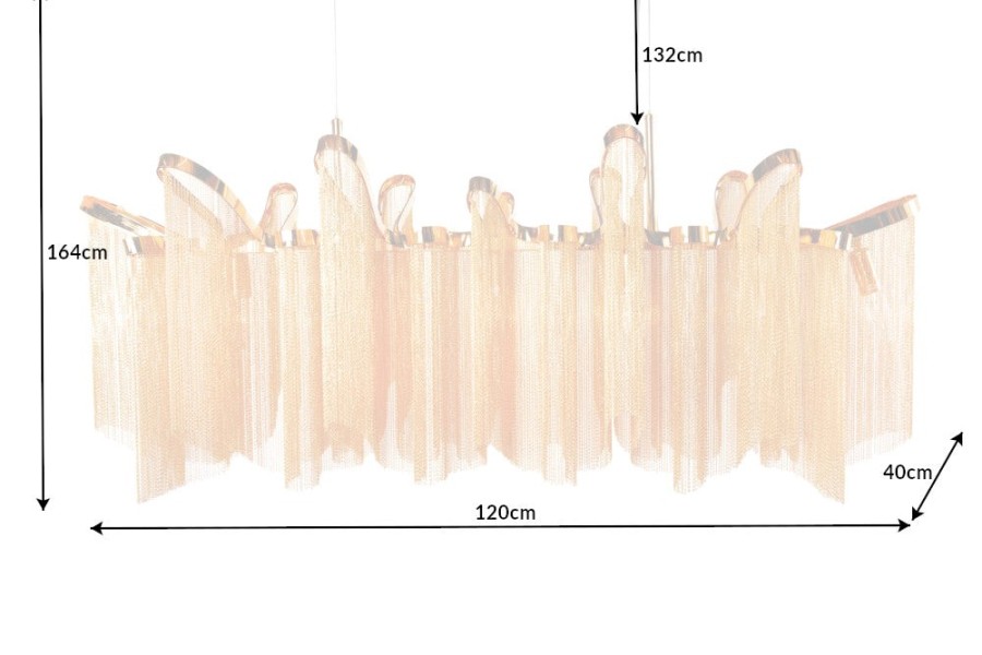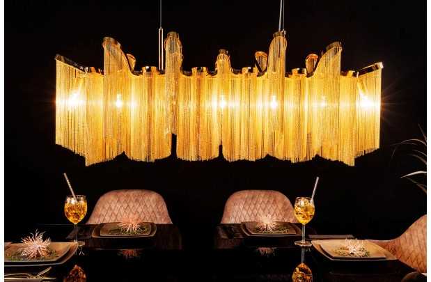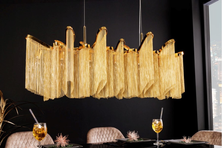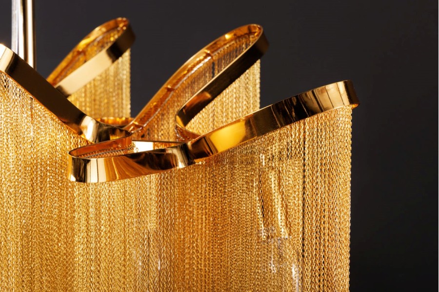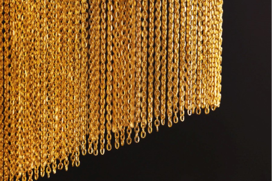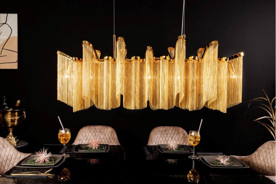 - Design audacieux et moderne : Les fines chaînes dorées tombent en cascade, offrant un effet texturé et élégant tout en diffusant la lumière de manière douce.