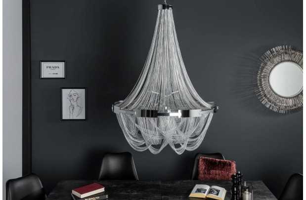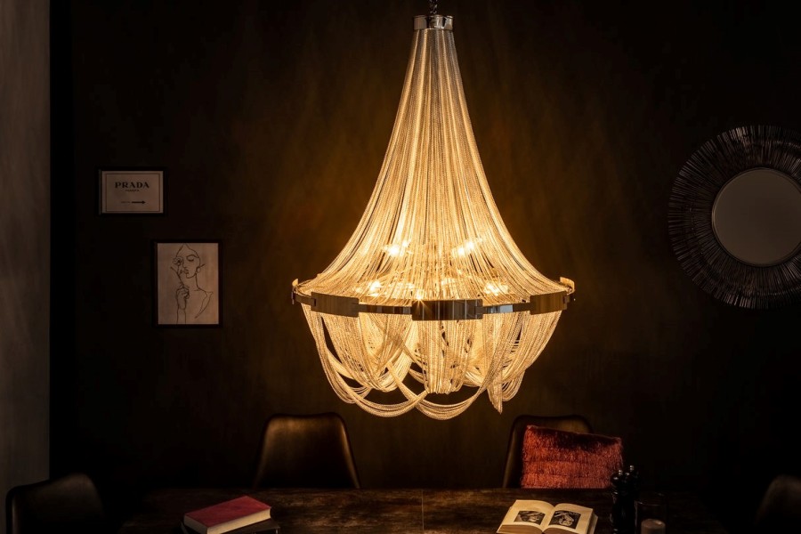 - Abat-jour : Des centaines de fines chaînes métalliques argentées, créant un effet visuel captivant et diffusant la lumière de manière subtile.