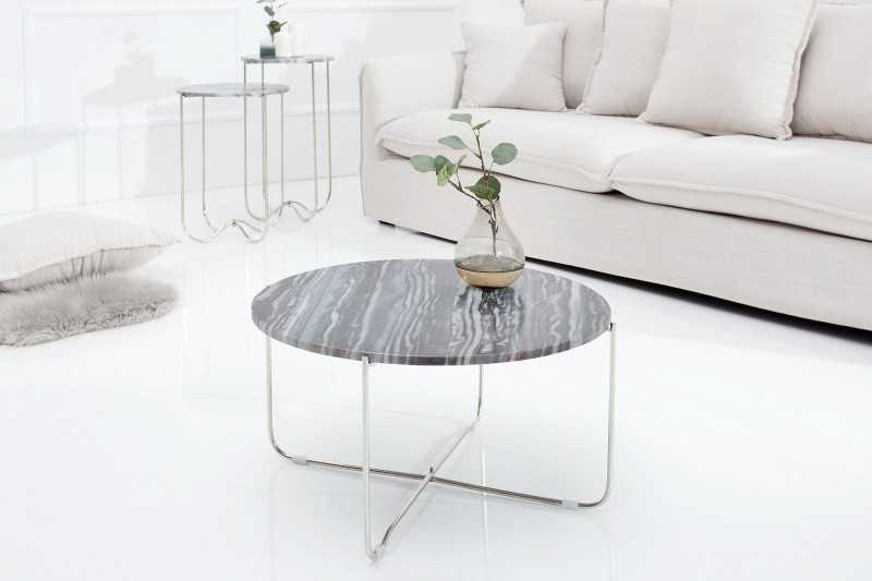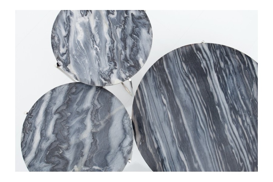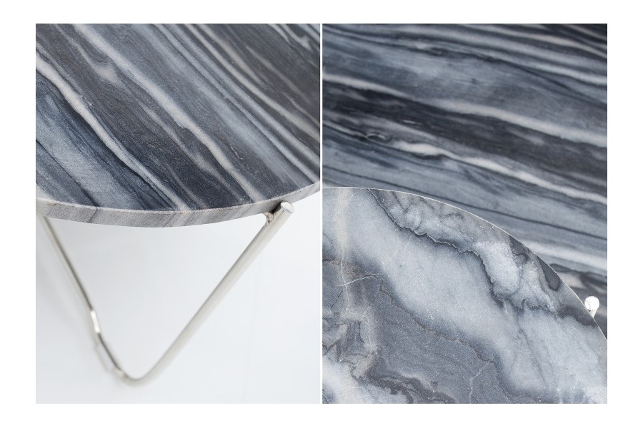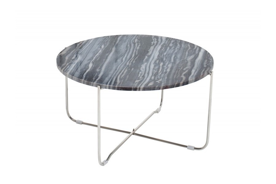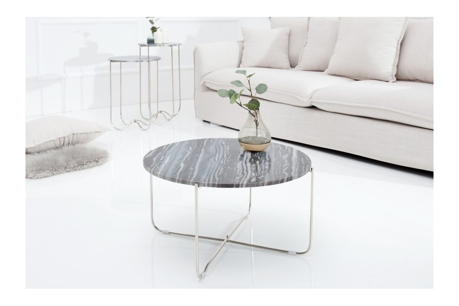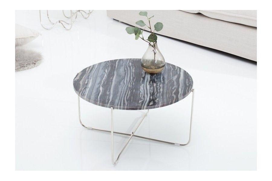 Table basse design en marbre coloris gris avec piétement en métal argenté