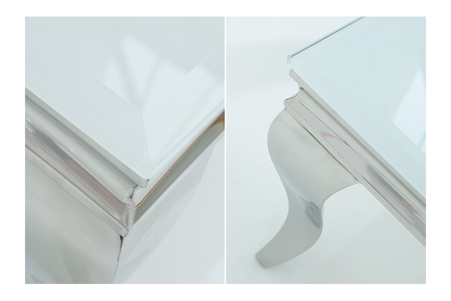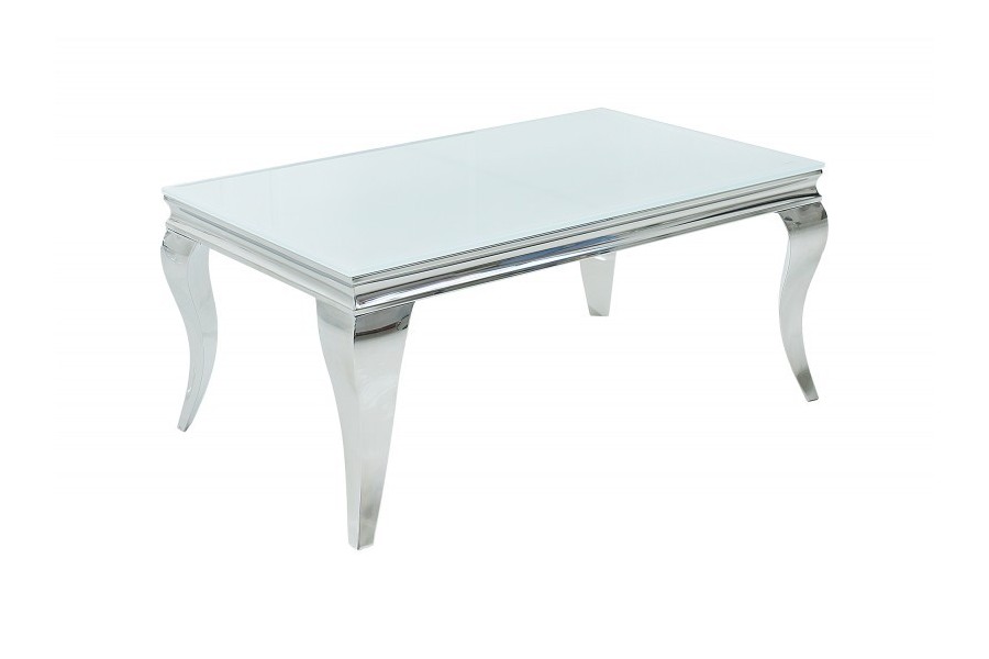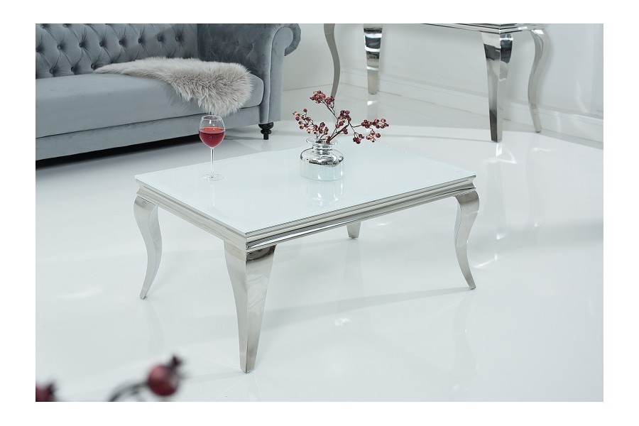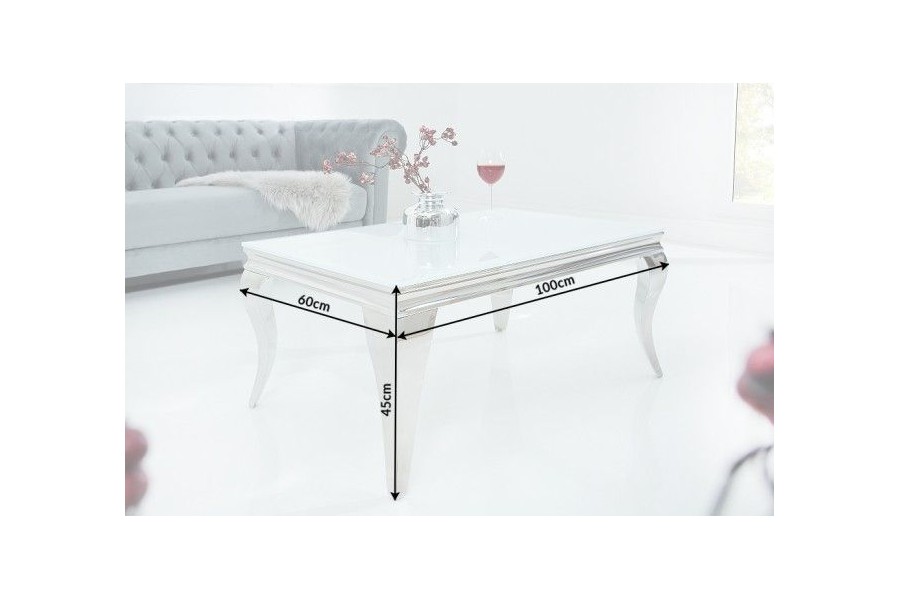 Élégante table basse contemporaine coloris argenté et blanc ! Elle est composée d’un grand plateau rectangulaire en verre trempé monté sur une structure en acier inoxydable solide et résistant. Son design baroque est très authentique avec des coloris brillants et épurés ! Elle ornera parfaitement la décoration de votre salle à manger !