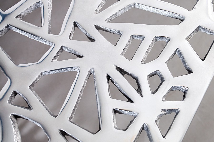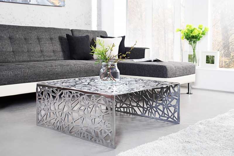 Une table basse en aluminium argentée avec son motif comme de la broderie ajoutera une touche de luxe et d’originalité à votre décoration intérieure.