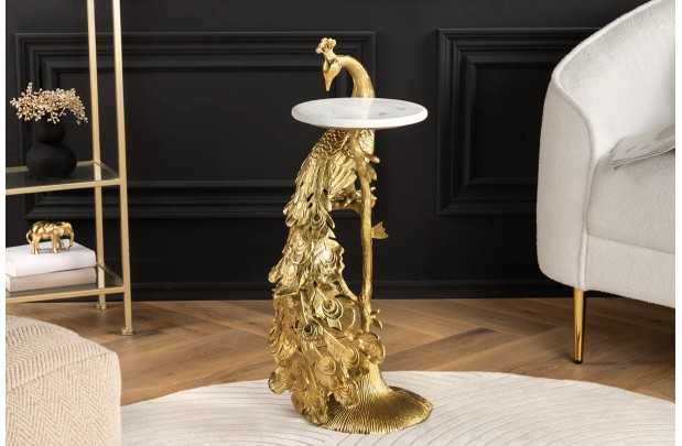 - Cette table met en scène un paon sculpté en position majestueuse, avec des détails réalistes et une queue richement texturée.