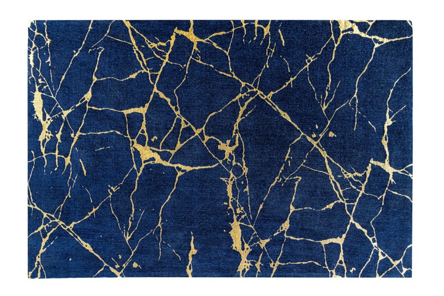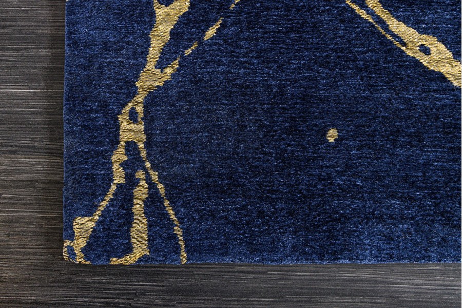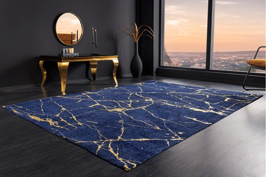 Le tapis MARBRE se distingue par son motif marbré sophistiqué, combinant des nuances profondes de bleu royal avec des accents dorés éclatants. Ce design raffiné s'inspire des textures naturelles du marbre, apportant un aspect luxueux et intemporel à votre intérieur.