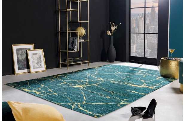 Le tapis MARBRE se distingue par son motif marbré sophistiqué, combinant des nuances profondes de vert sarcelle avec des accents dorés éclatants. Ce design raffiné s'inspire des textures naturelles du marbre, apportant un aspect luxueux et intemporel à votre intérieur.